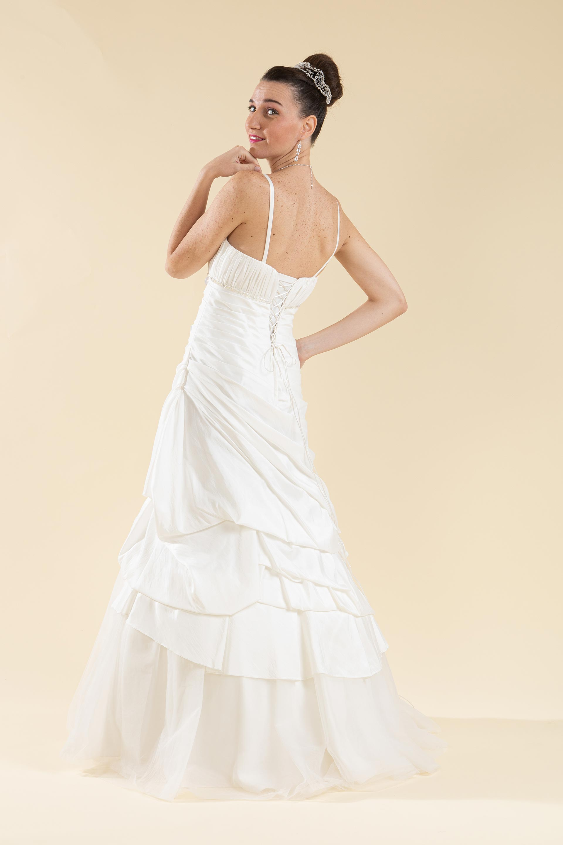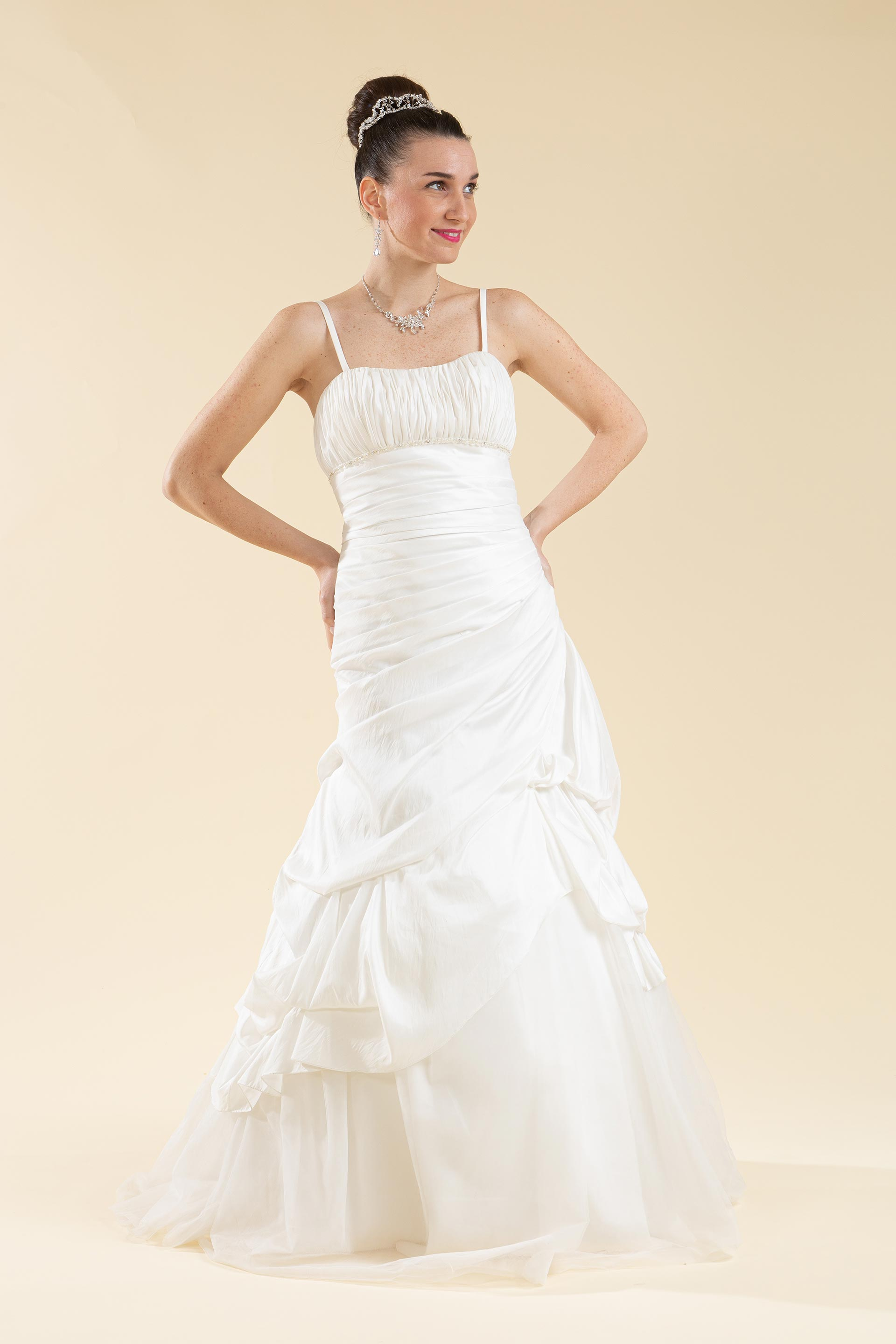 Abito sposa a décolleté semi sirena, drappeggiato con gonna ripresa e inserti in tulle.