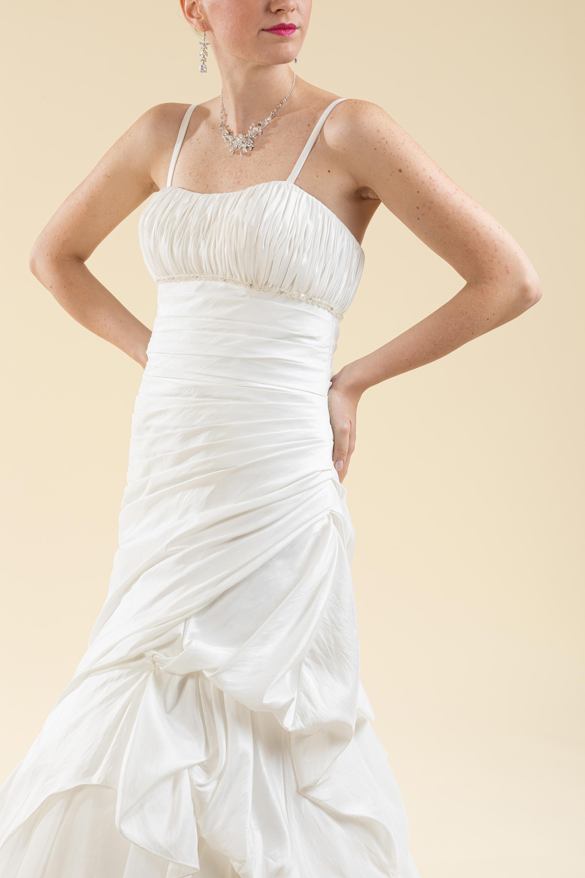 Abito sposa a décolleté semi sirena drappeggiato.