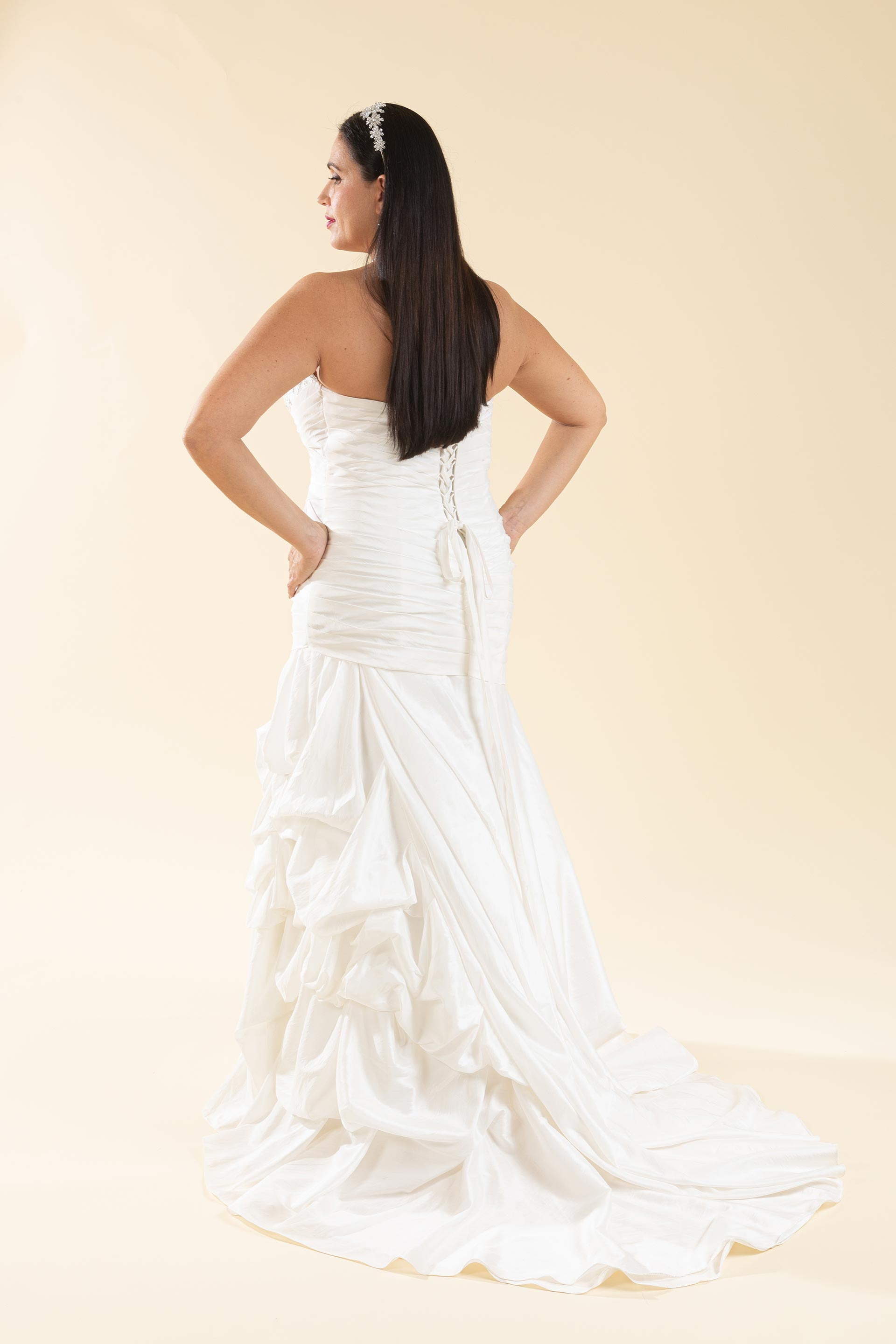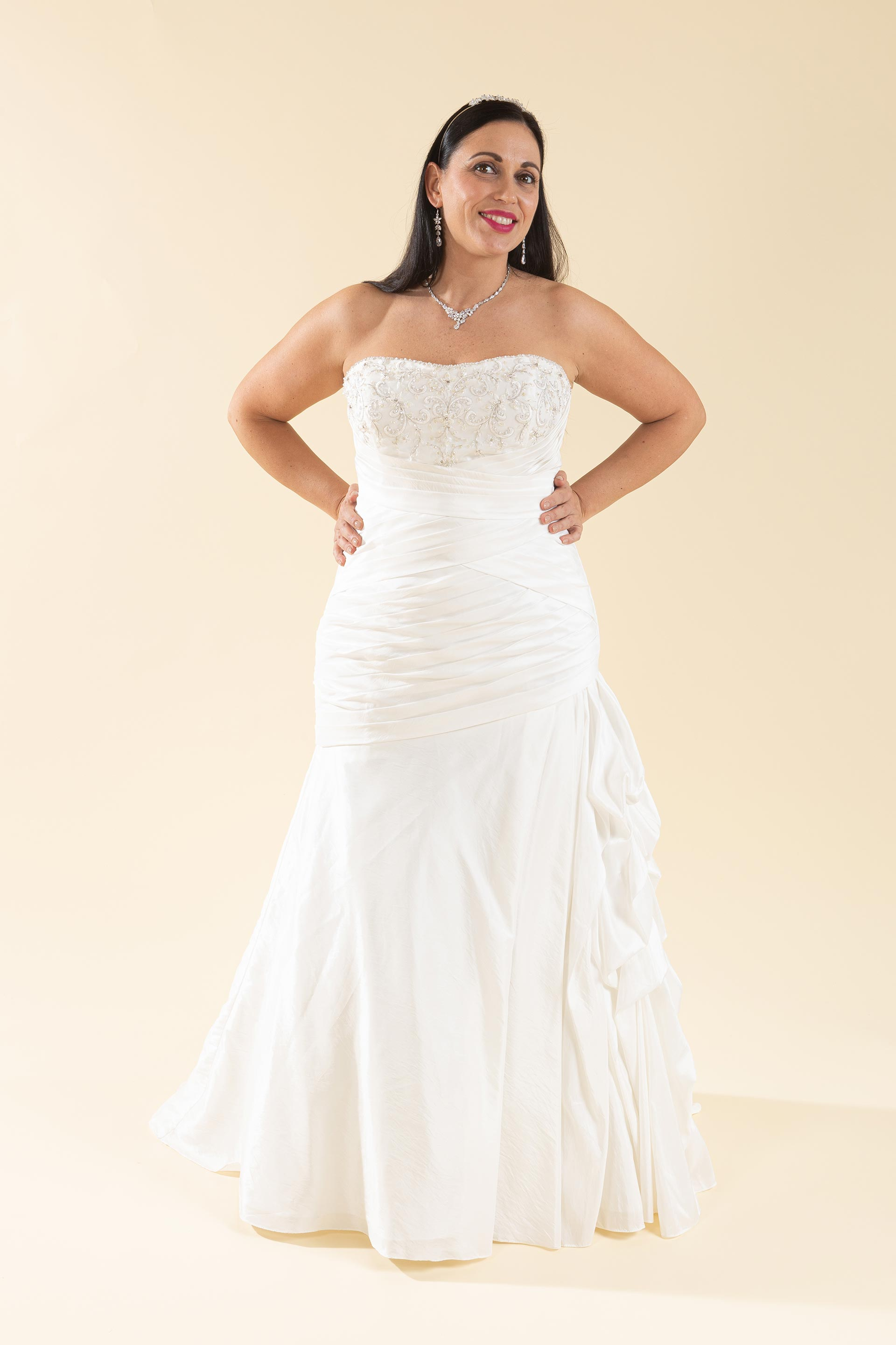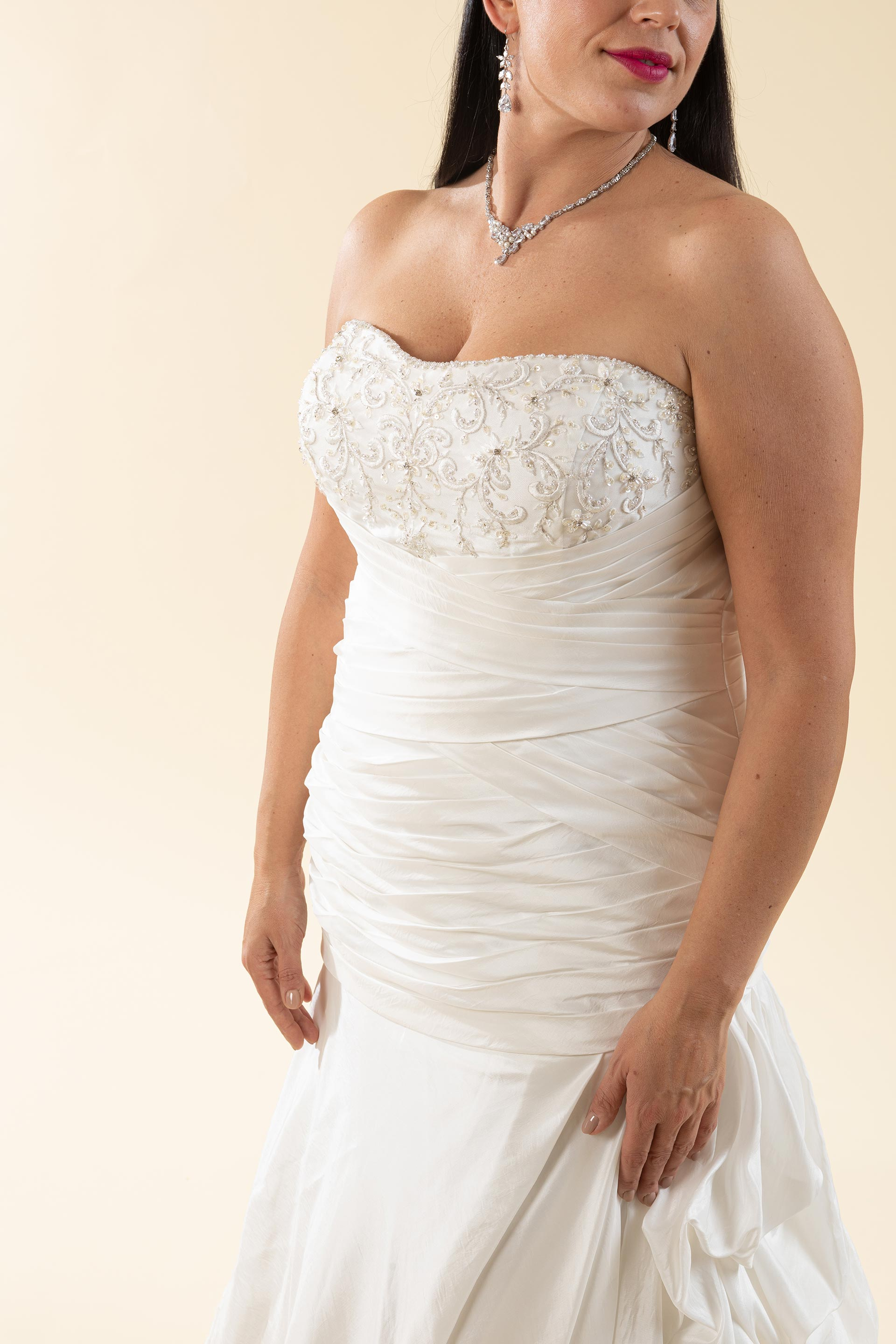 Abito sposa con scollatura a décolleté decorato con ricami luminosi e linea drappeggiata che valorizza le curve, l'abito è realizzato in tessuto di taffetà con chiusura regolabile a laccetti.