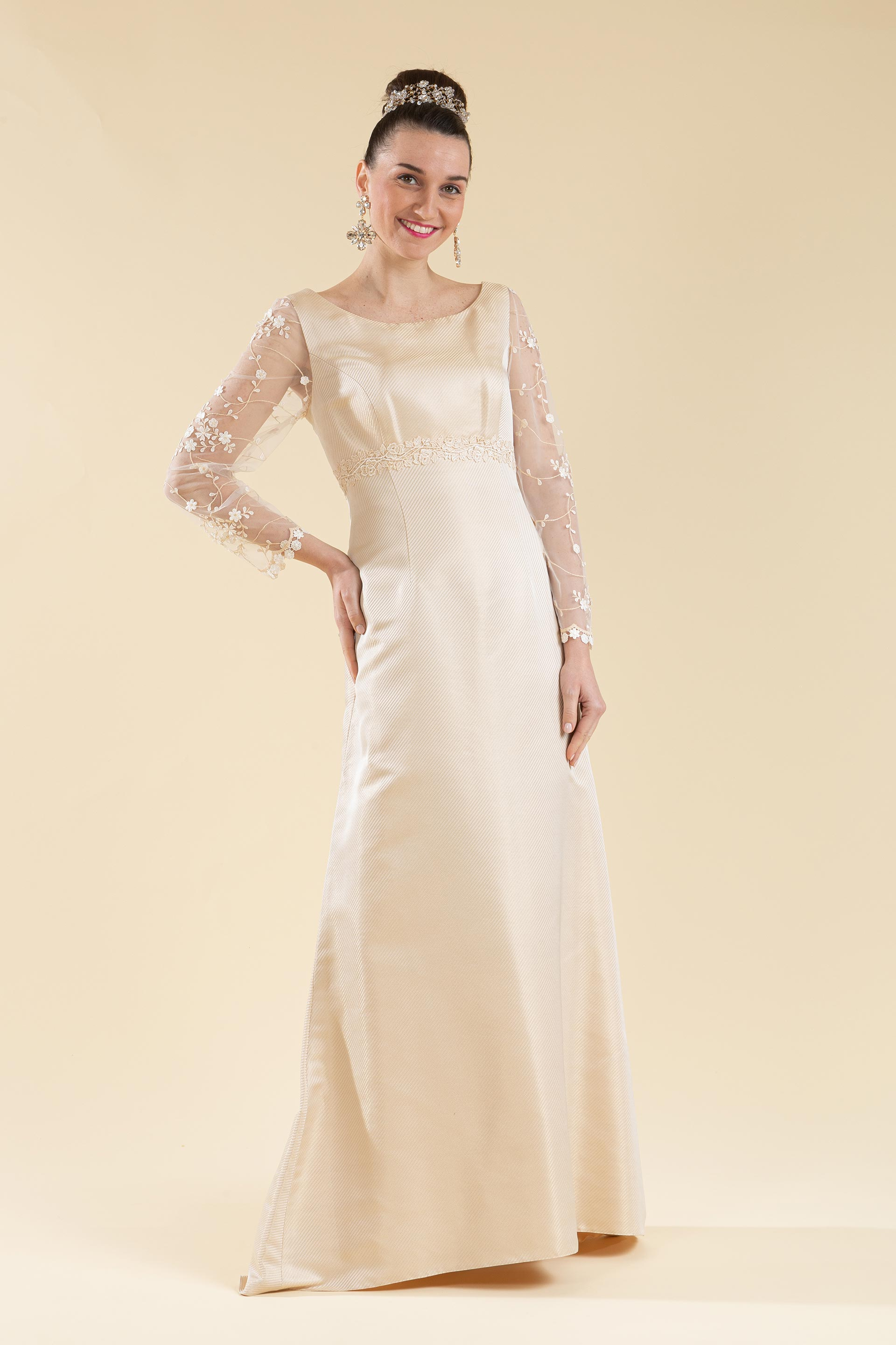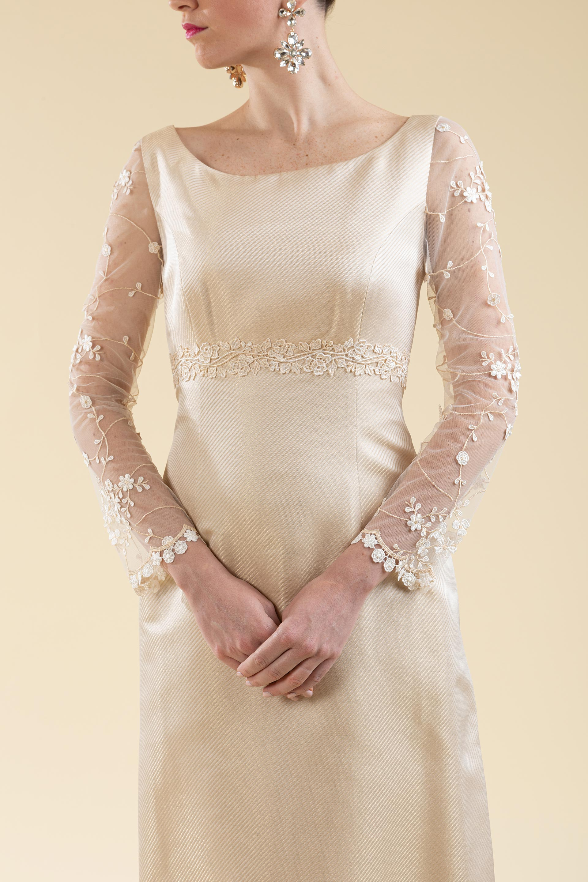 Abito sposa linea svasata con taglio sotto seno realizzato in tessuto di mikado avori caldo con riflessi dorati, le maniche sono lunghe in pizzo semi trasparenti, un abito di linea semplice con dettagli particolari.