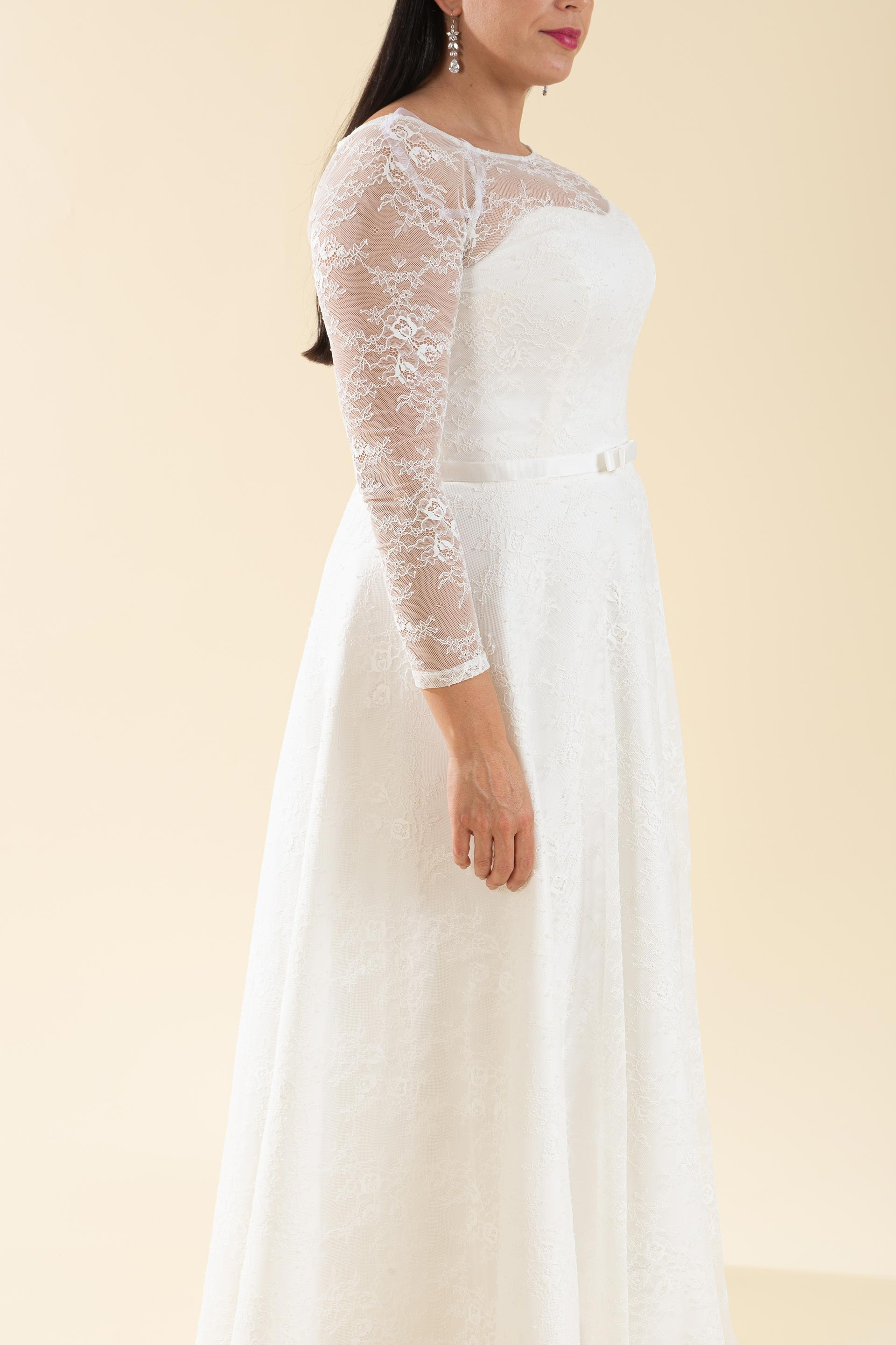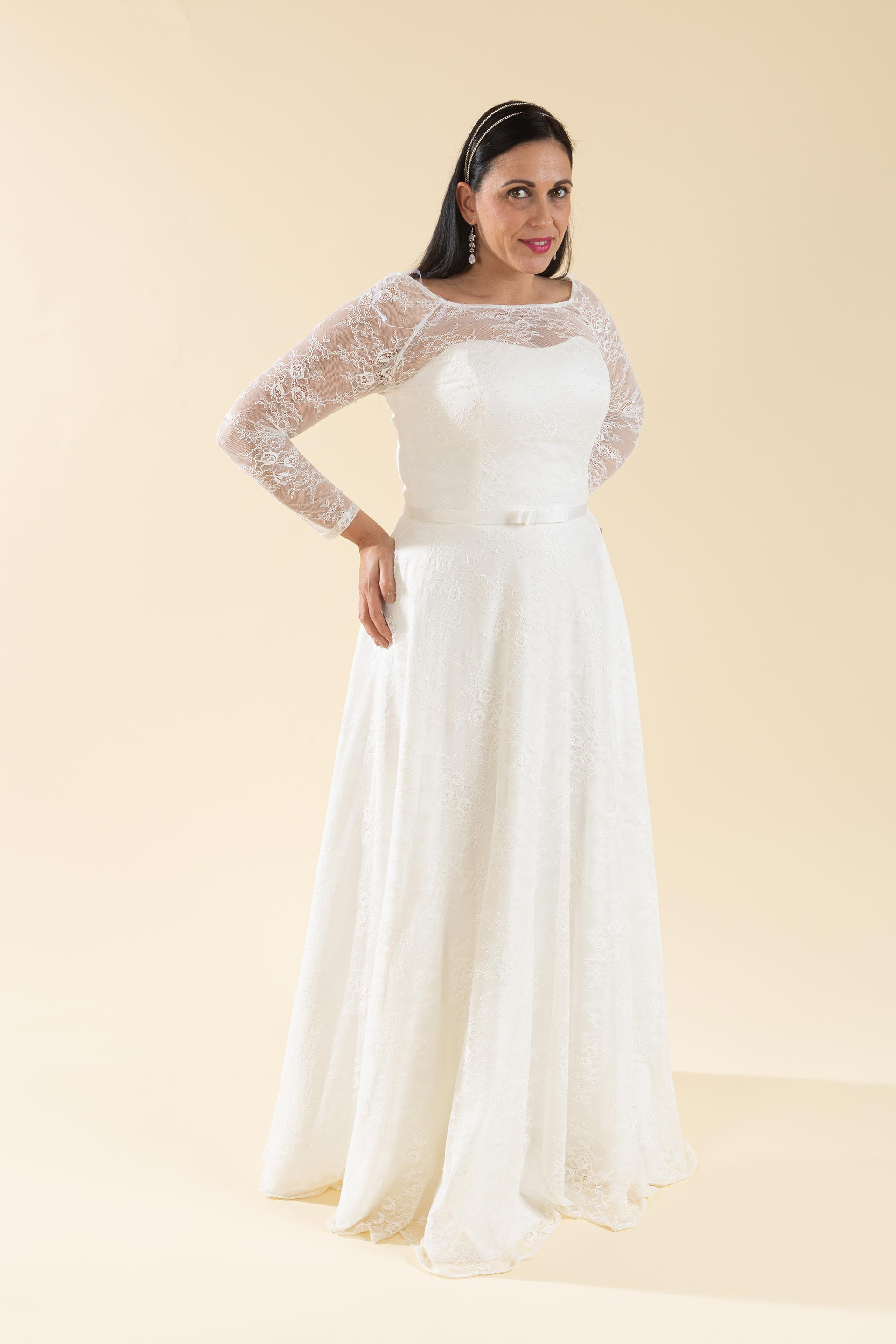 Abito sposa in pizzo con manica lunga.