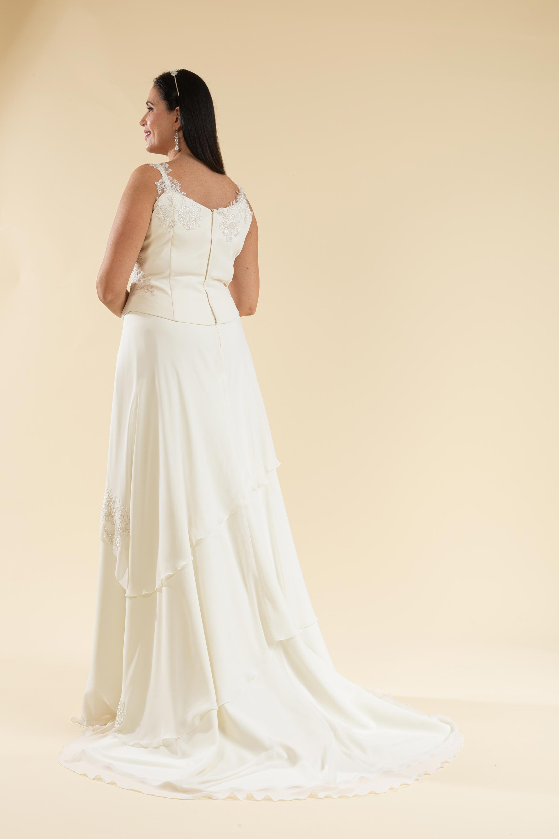 Abito sposa composto da bustino realizzato in voile con applicazioni in pizzo ricamato spallina sottile scollo tondo e leggero drappeggio laterale fermato da un elegante fibbia di strass, la gonna è realizzata in voile a balze.