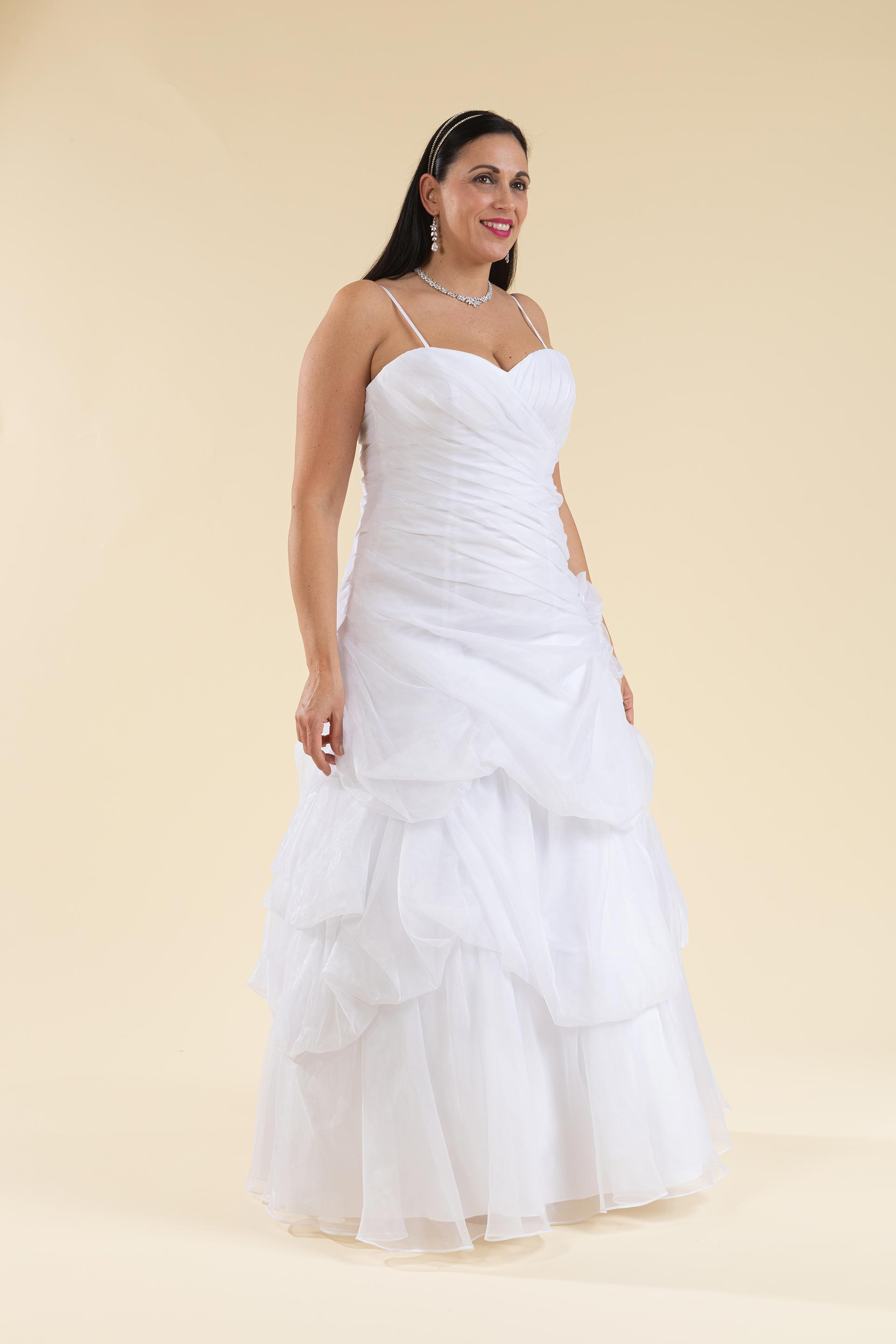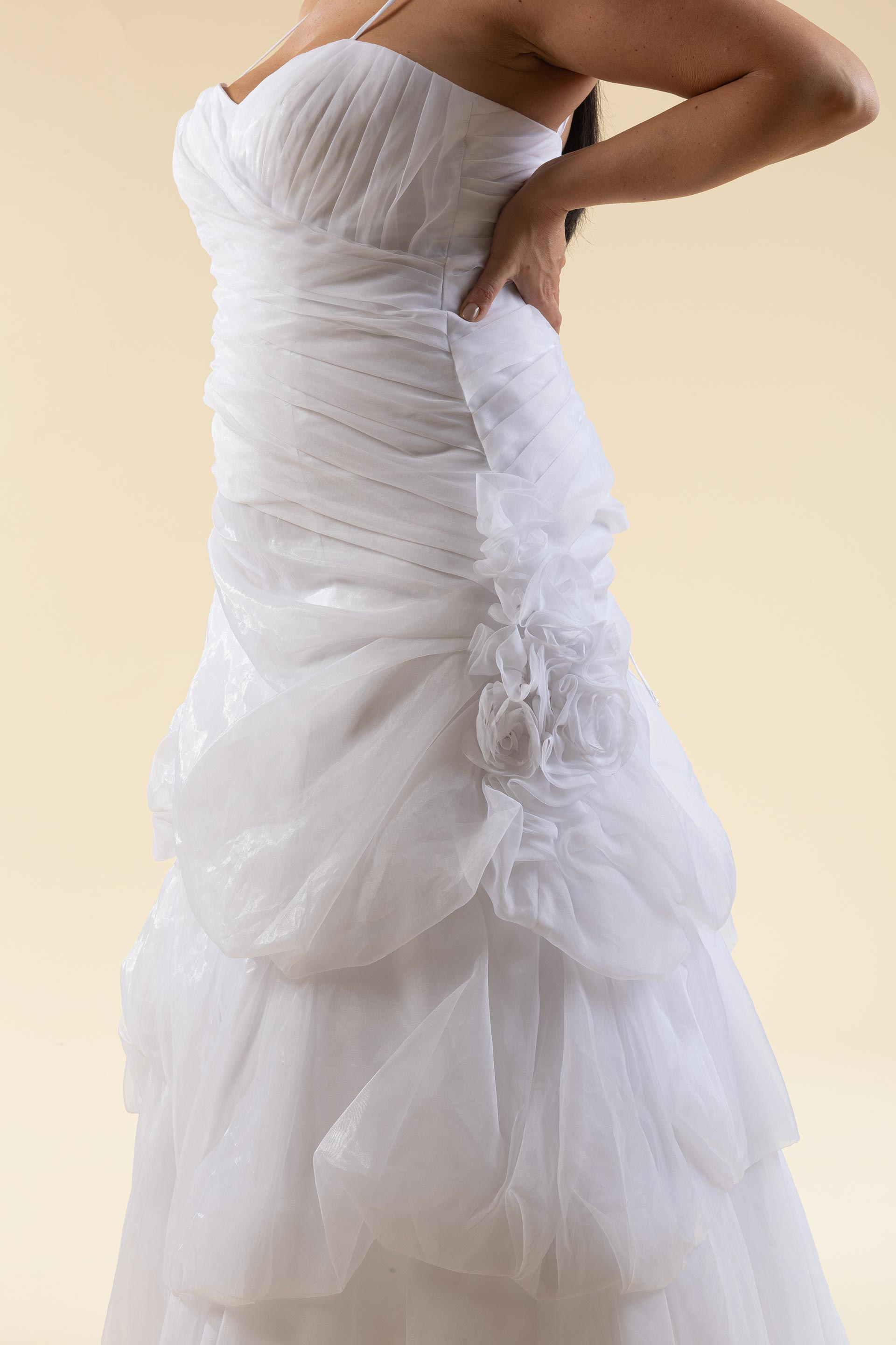 Abito sposa drappeggiato con scollo a cuore e gonna ripresa realizzato in tessuto di organza con chiusura a laccetti.