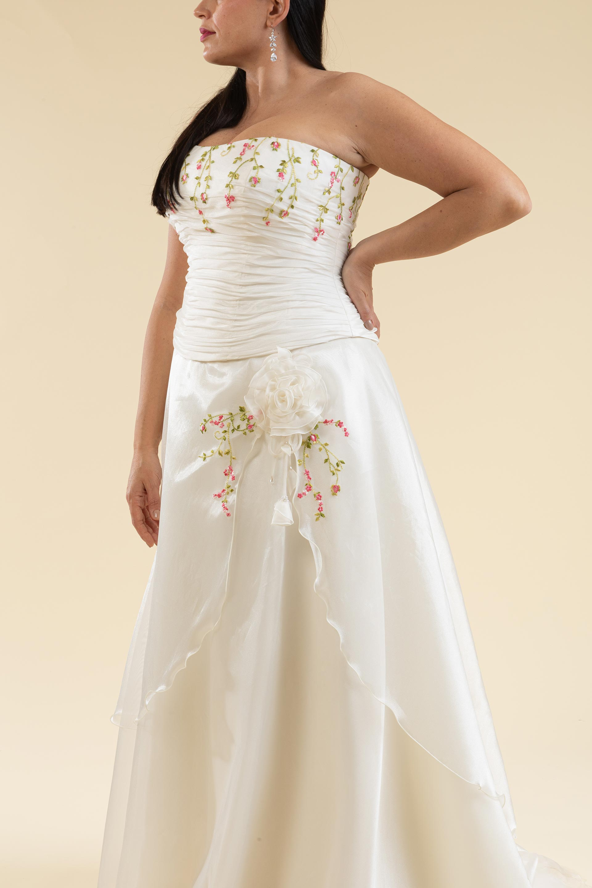Abito sposa 2 pz. comosto da bustino drappeggiato in organza con inserti di pizzo disegno floreale fuxia/verdino, la gonna è a linea svasata ad effetto ripreso con applicazione floreale interamente realizzata a mano.