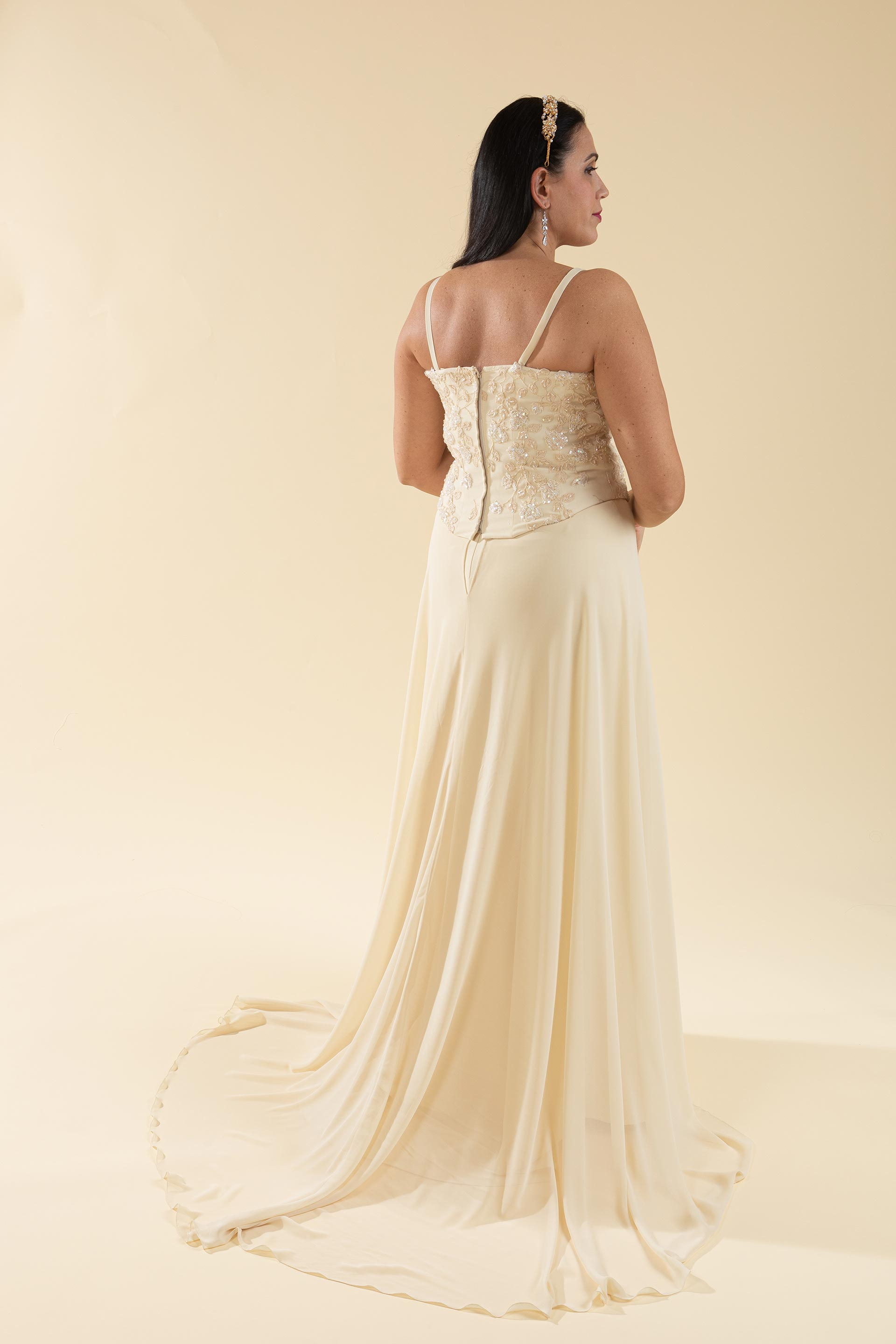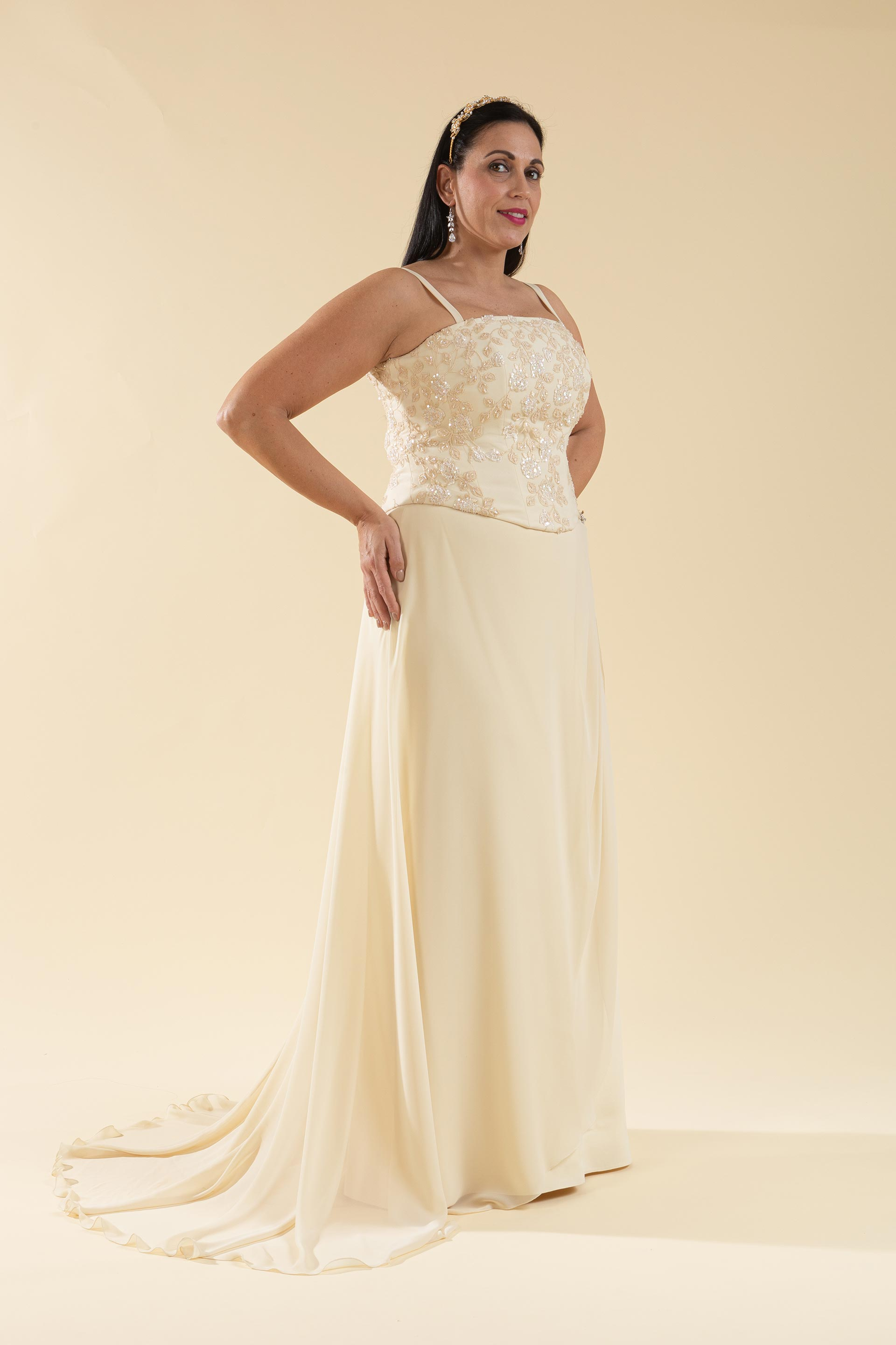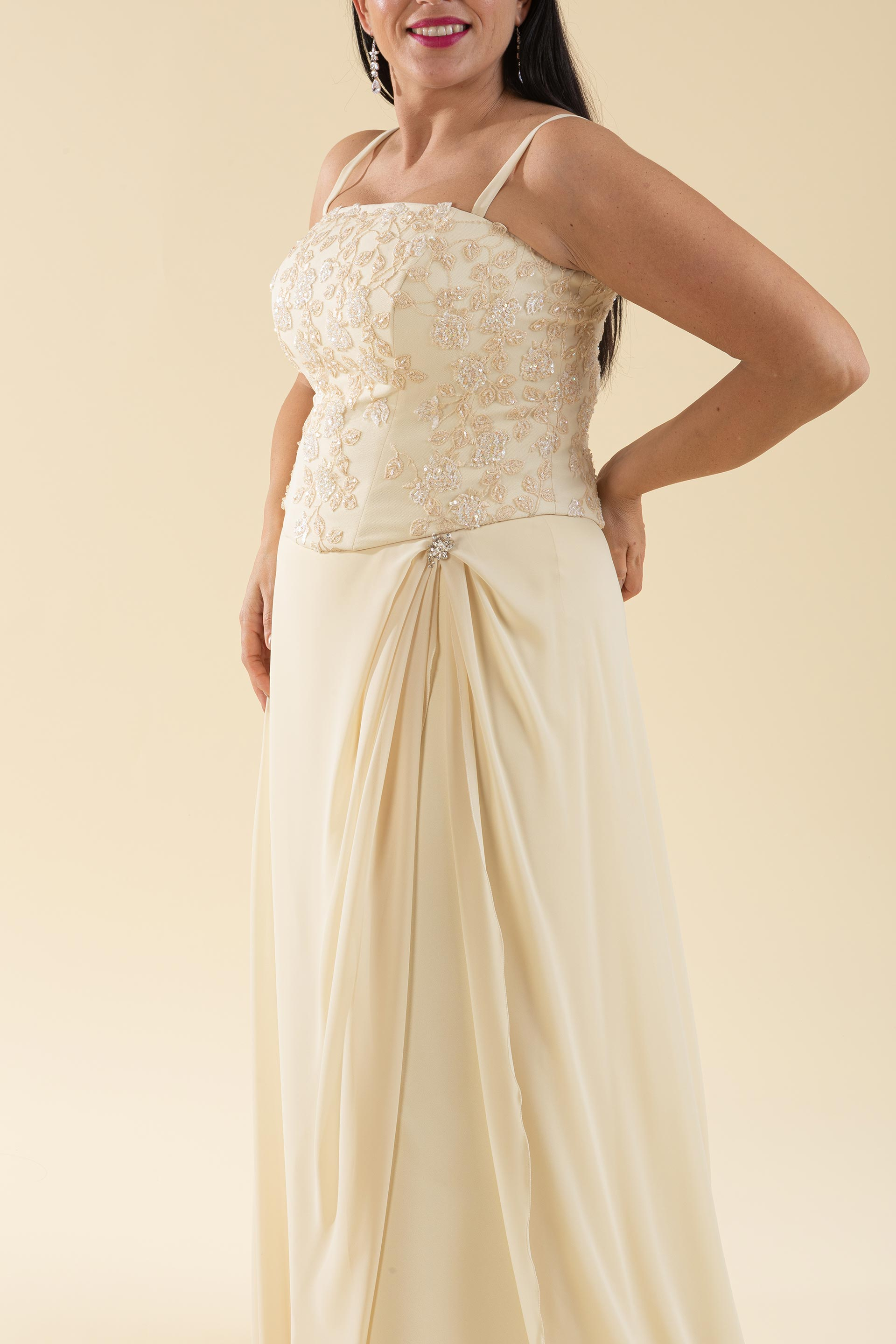 Abito sposa 2 pz. composto da bustino realizzato in pizzo ricamato con spallina sottile e gonna morbida scivolata in voile con effetto ripreso e fermato da dettaglio in strass.