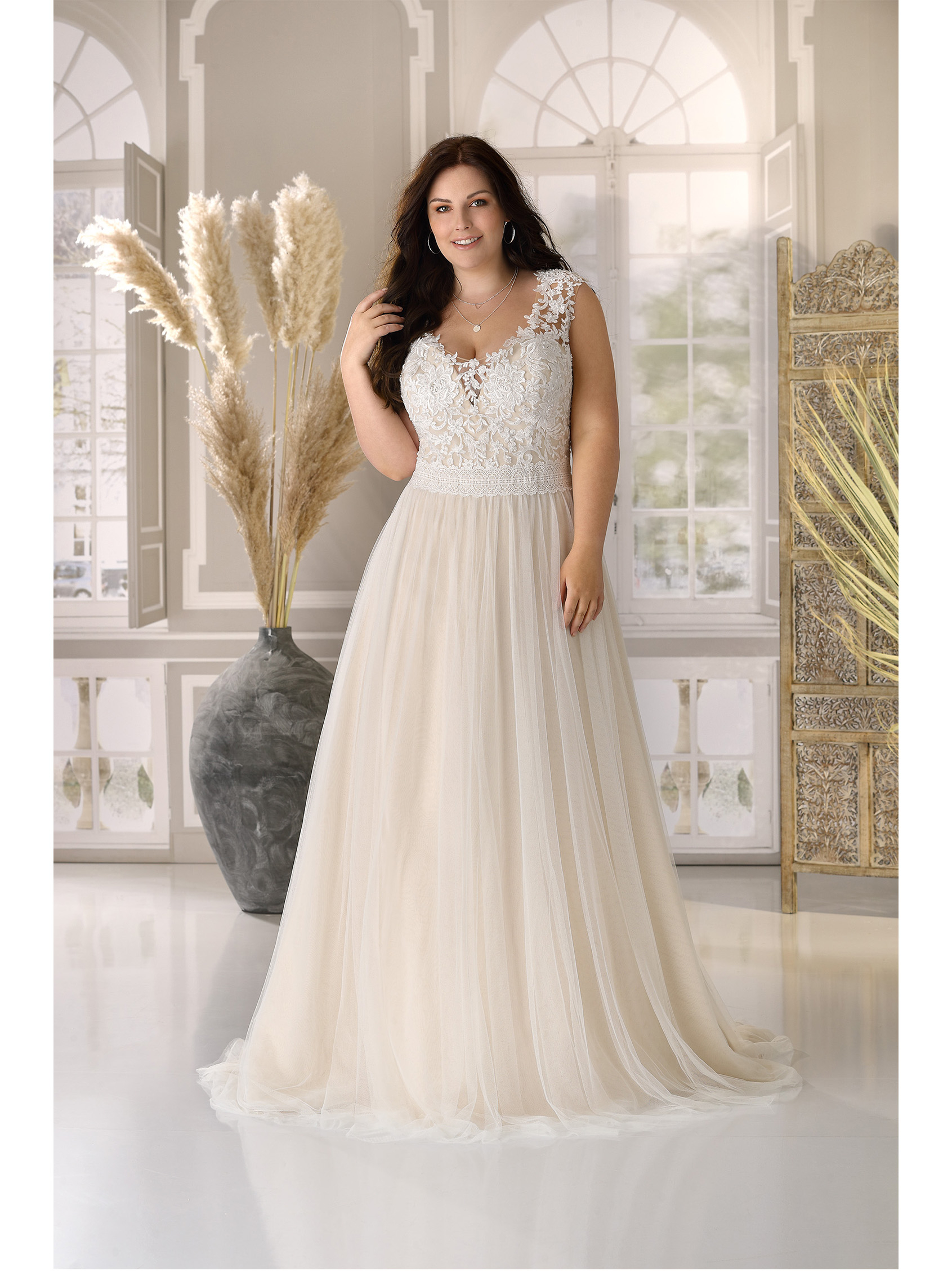 Abito sposa scivolato in tulle con corpetto in pizzo.
