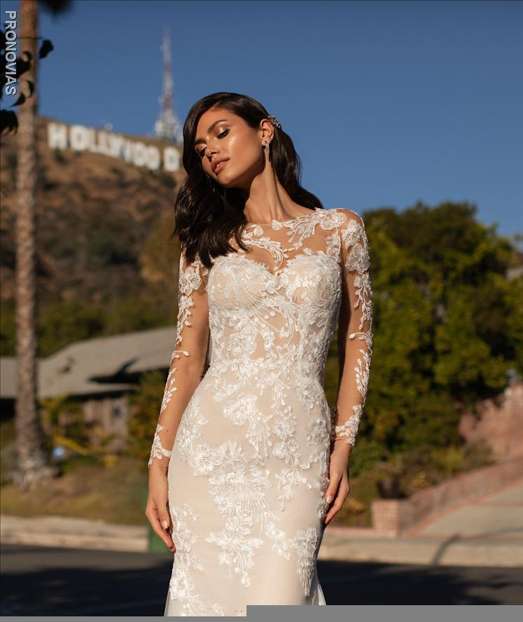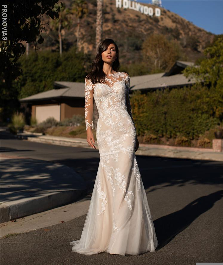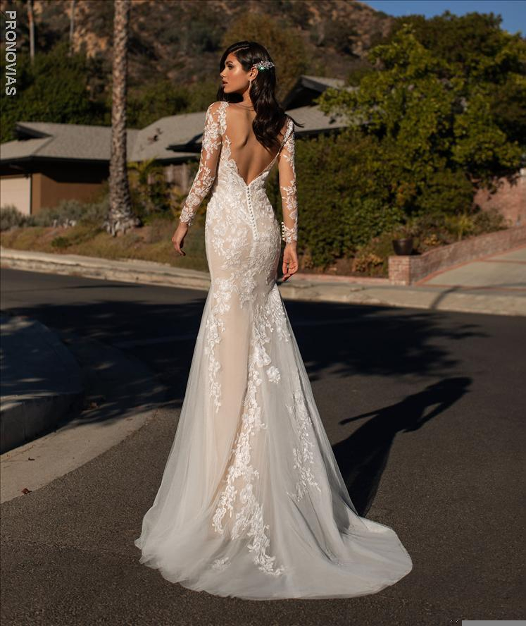 Il soffice tulle ricamato diventa a sorpresa una silhouette scultorea in questo abito da sposa aderente che scopre la schiena e incornicia collo e spalle con uno splendido pizzo trasparente con l'aggiunta di applicazioni floreali.