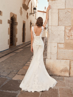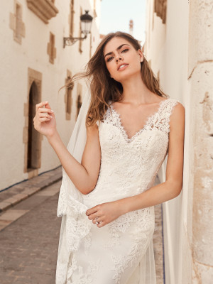 Abito sposa linea a sirena in pizzo con spallina larga in trasparenza, scollo a V e ampia coda.