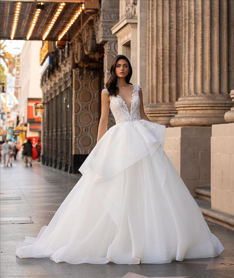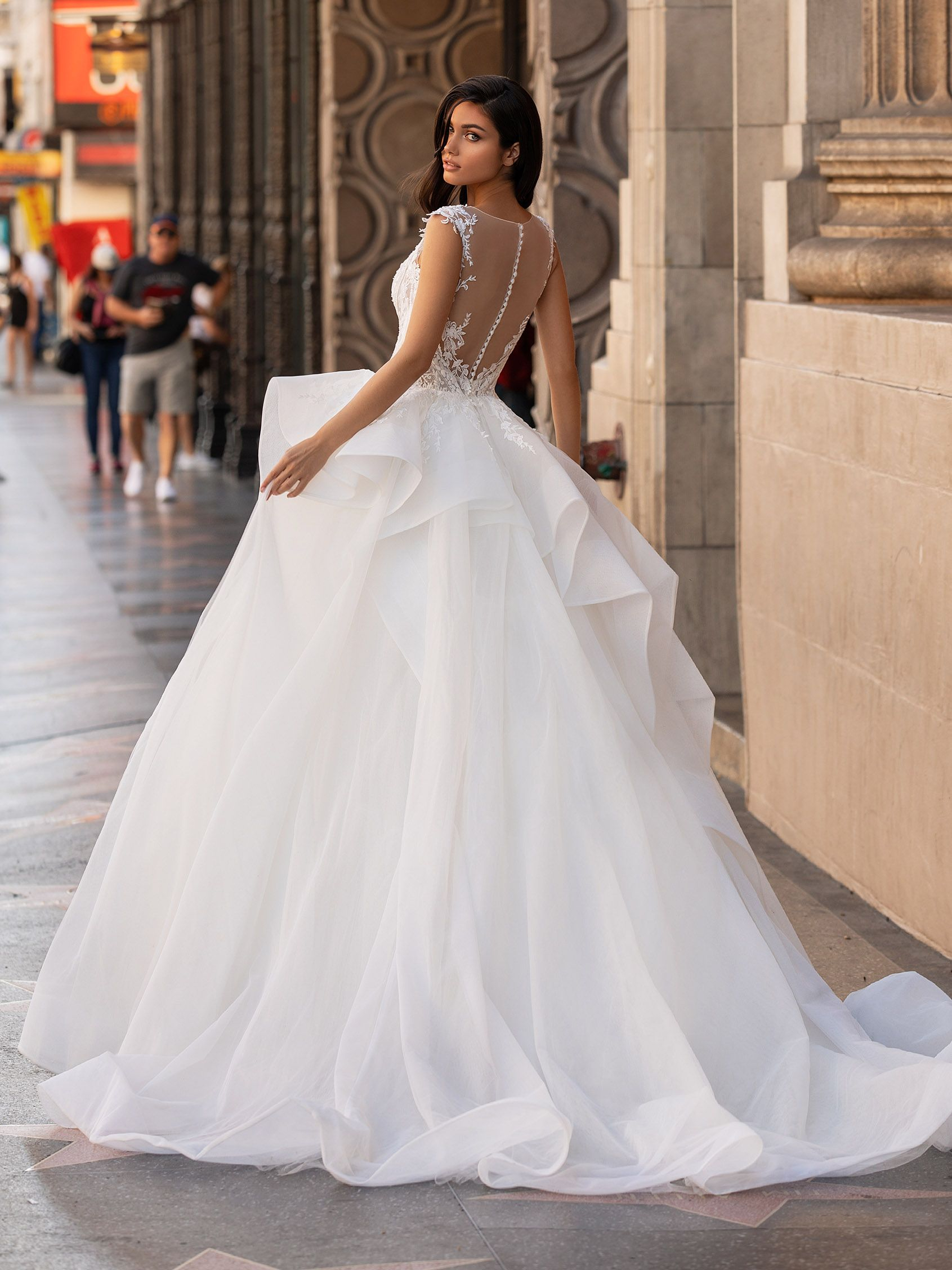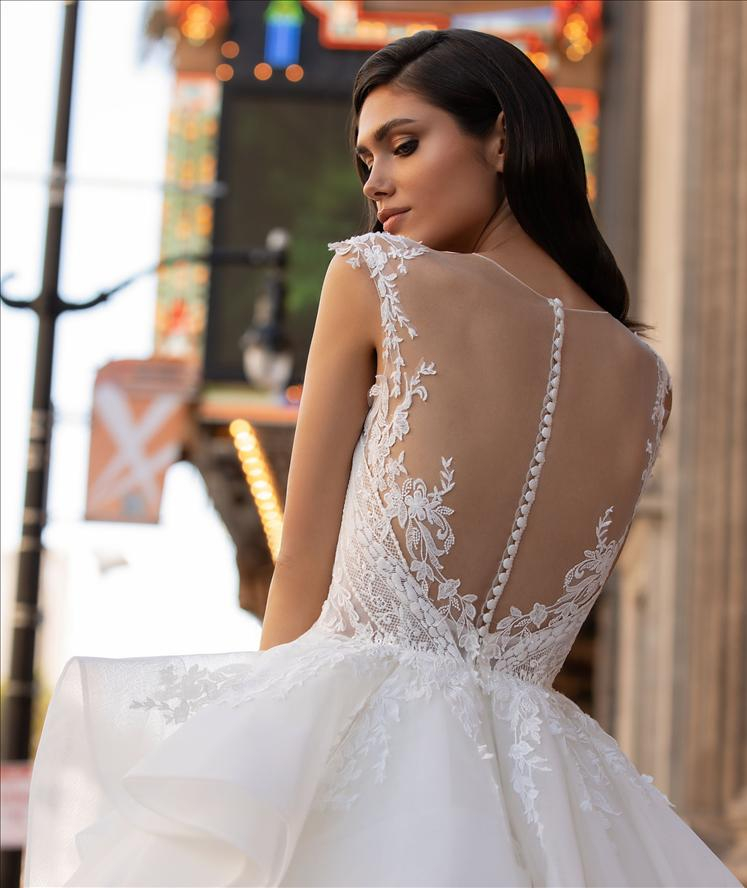 La gonna in tulle dai volumi extra e il corpetto aderente creano una silhouette che ricorda i classici abiti da ballo. Il corpetto aderente ispirato alla lingerie è caratterizzato da una schiena sensuale con pizzo effetto tattoo e una delicata fila di bottoncini.