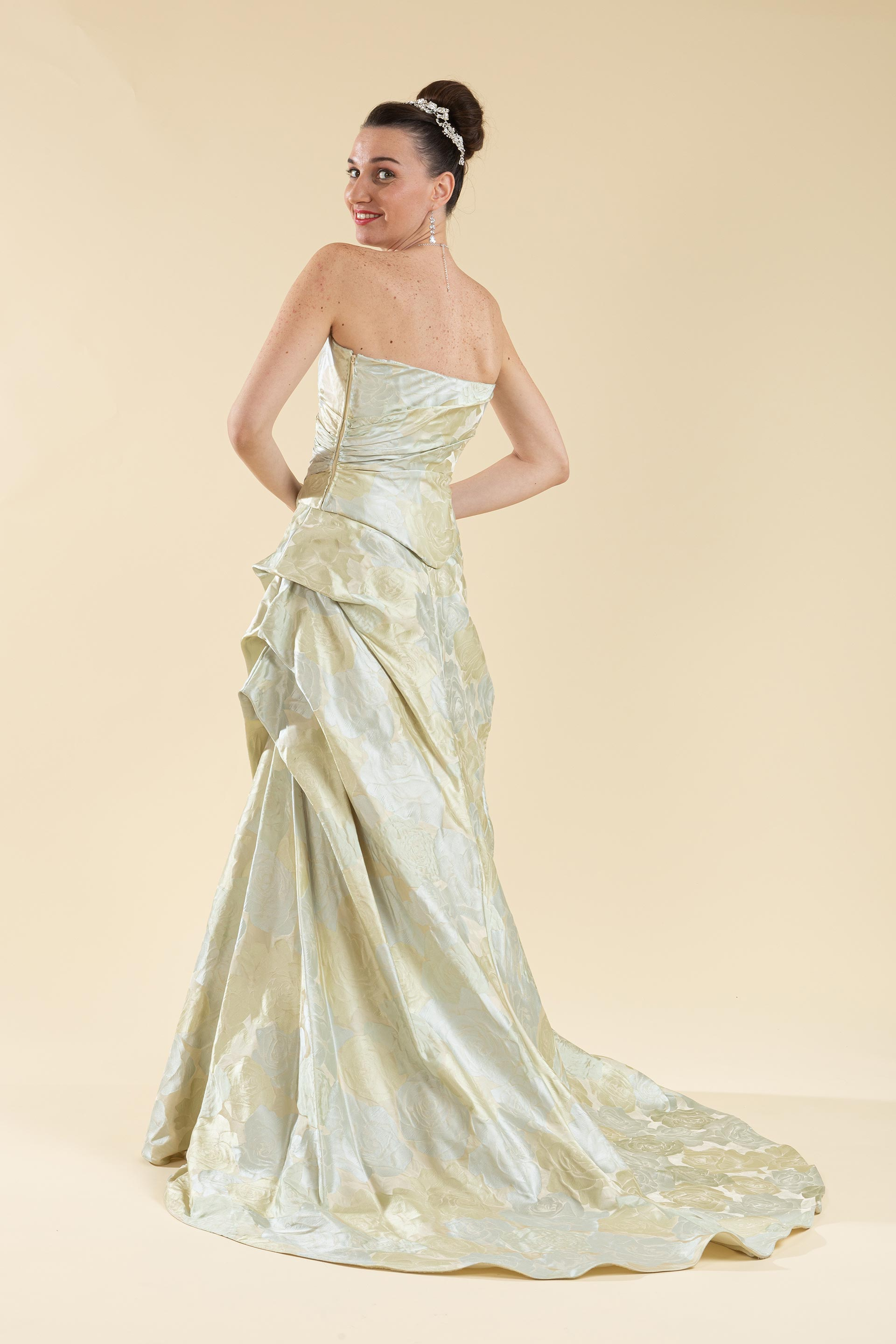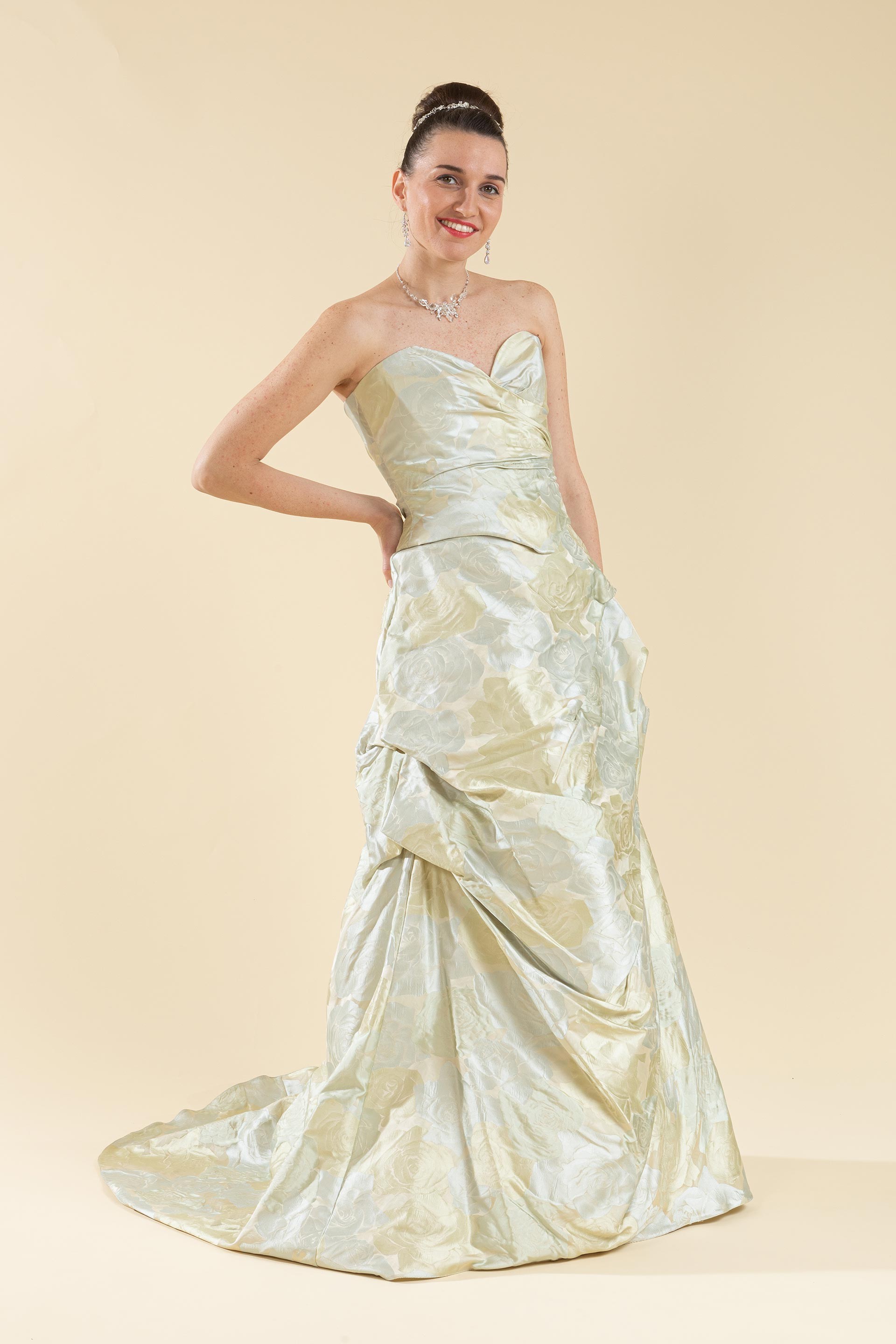 Abito sposa 2 pz. composto da bustino drappeggiato con scollo a cuore e gonna svasata e ripresa ampia realizzato in tessuto di broccato effetto floreale nei toni del celeste e verde