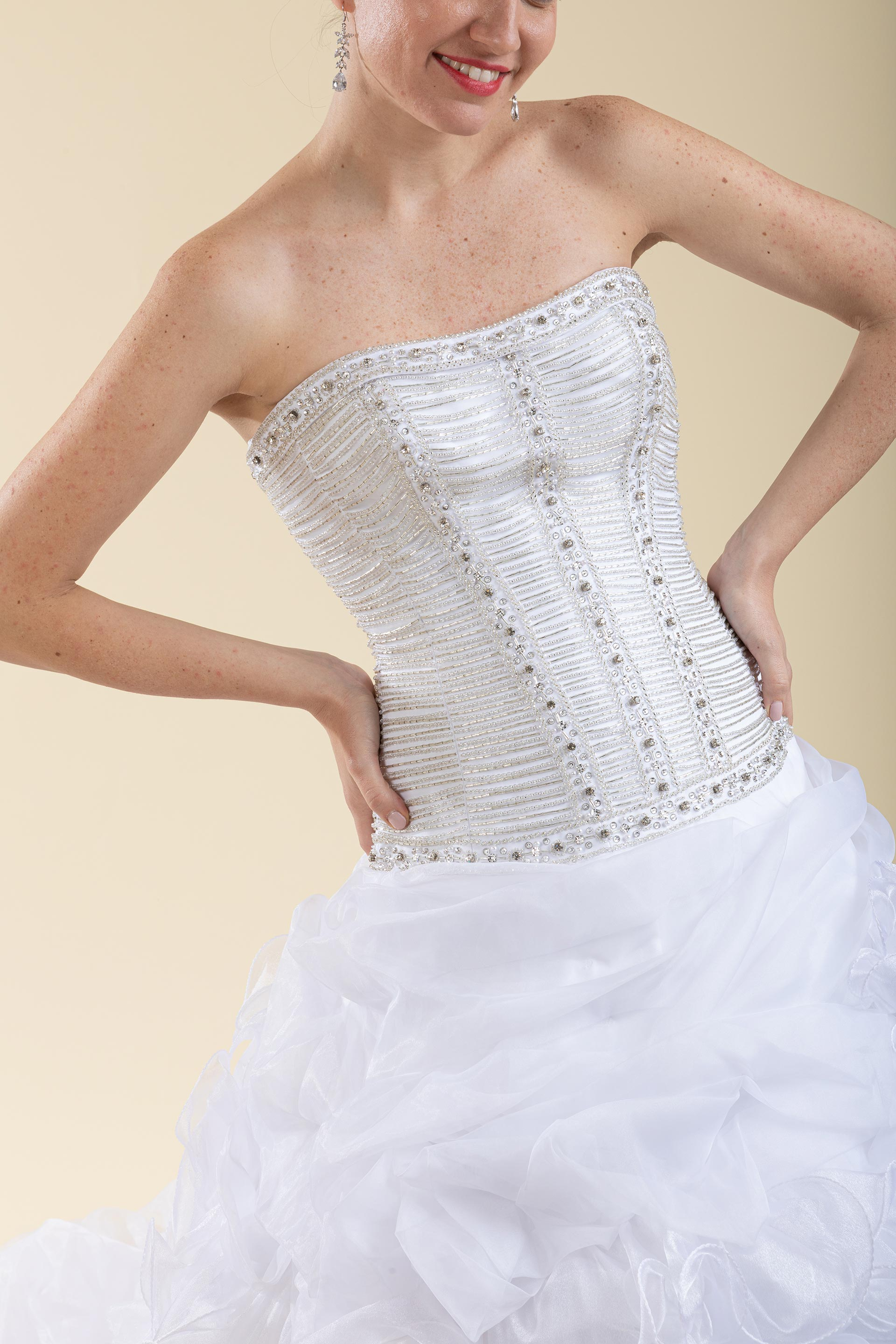 Abito sposa ampio realizzato con bustino ricamato in micro perline e gonna ripresa in organza.