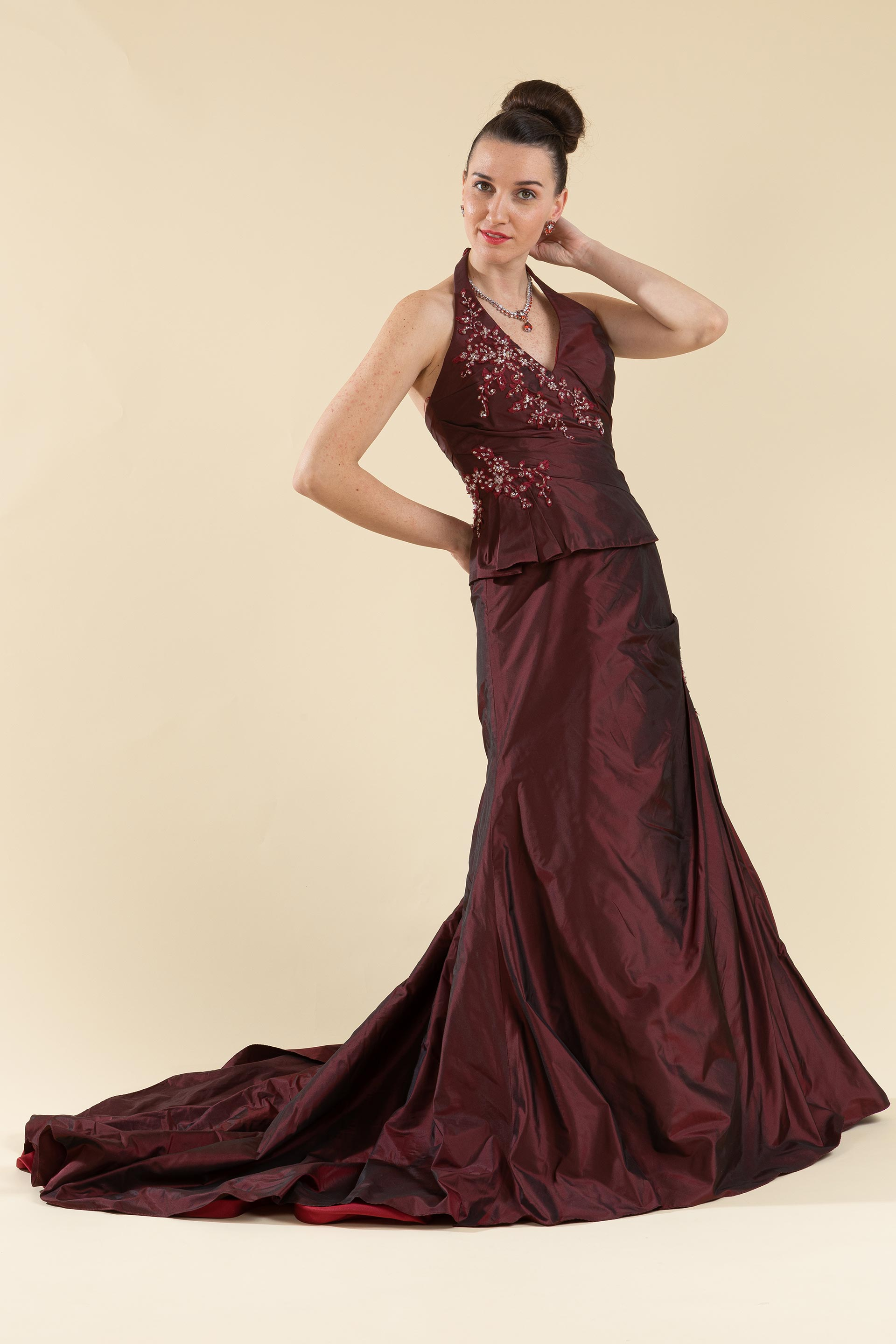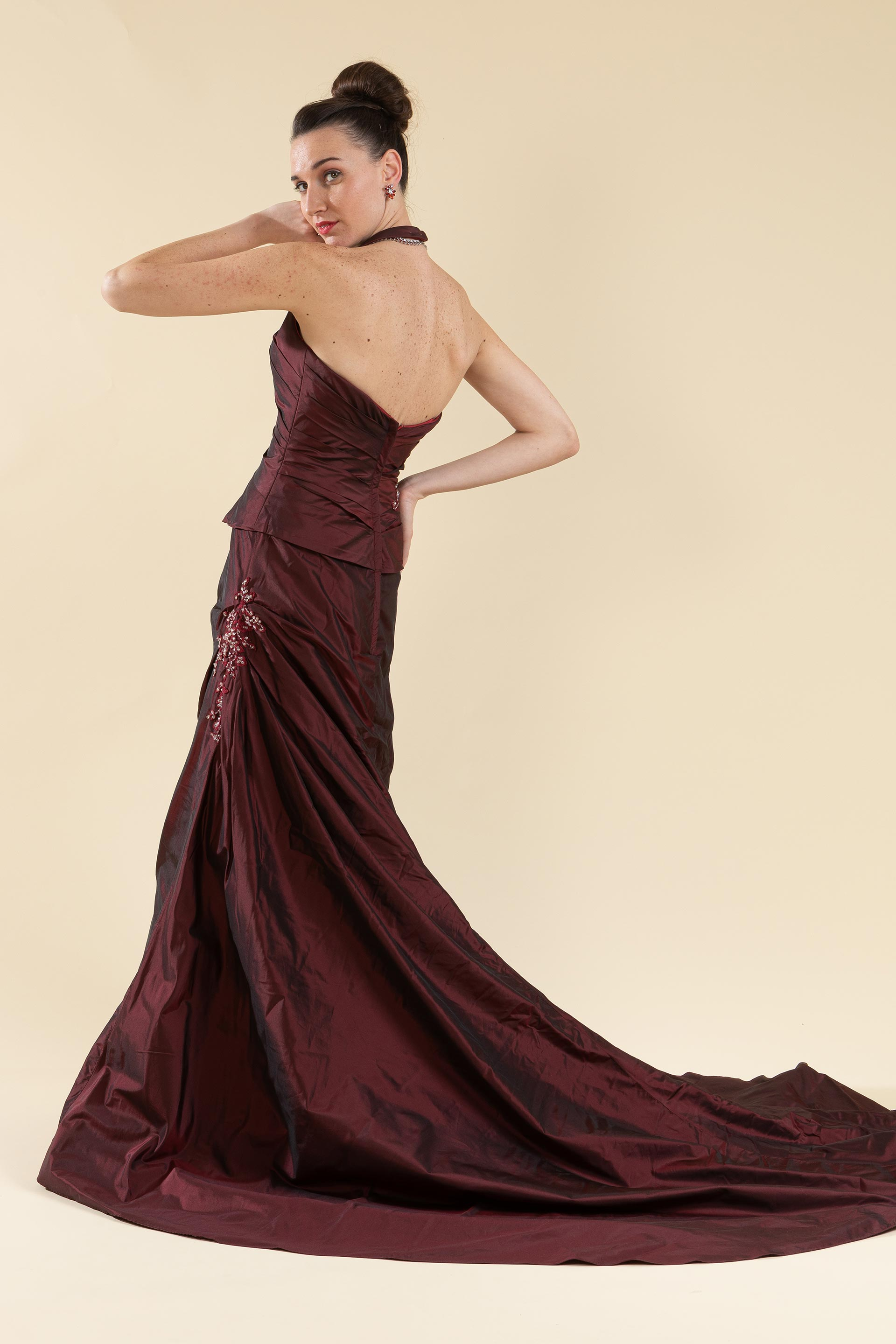 Abito sposa drappeggiato svasato con scolo all'americana realizzato in tessuto di tafetà impreziosito da applicazione in pizzo ricamata.