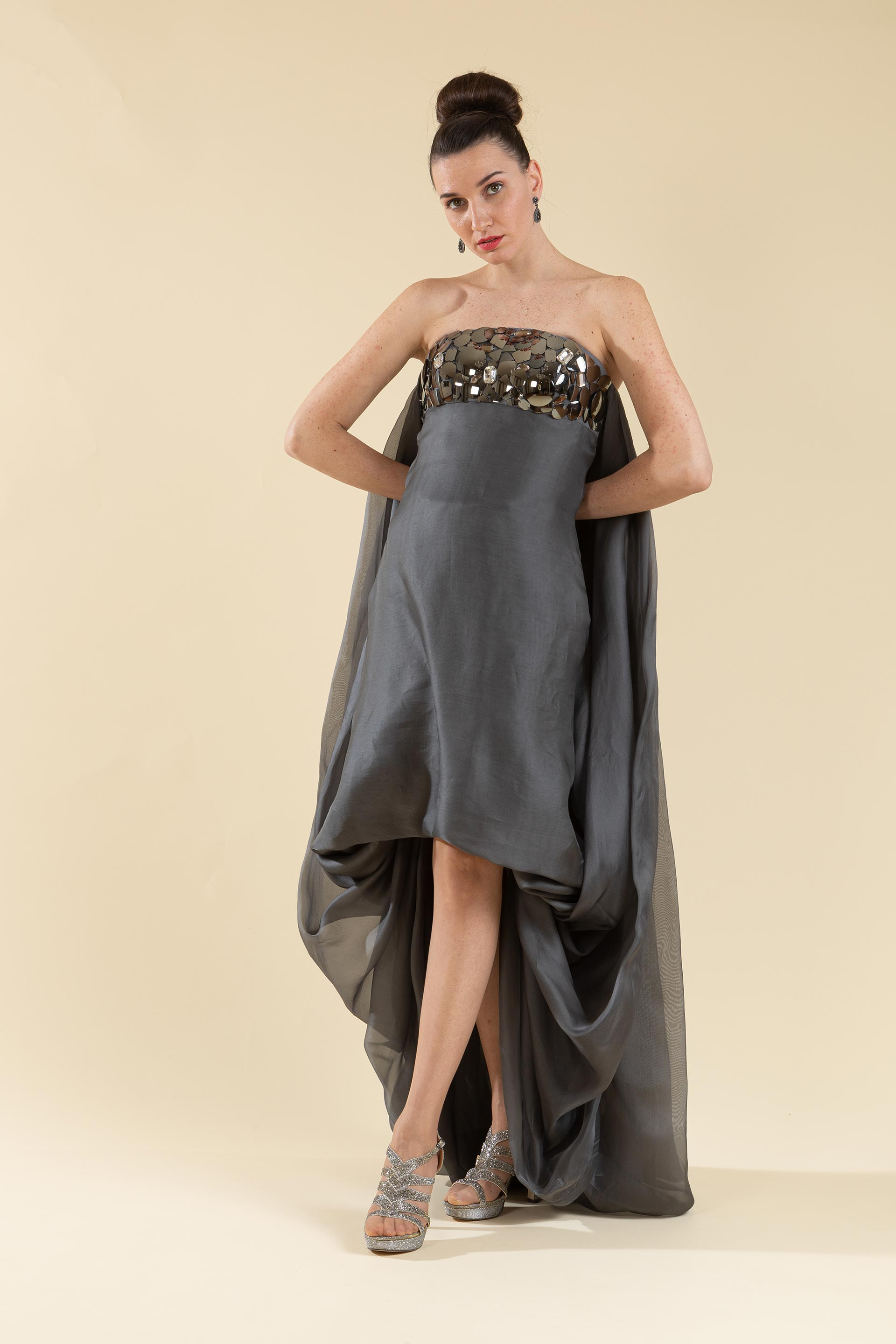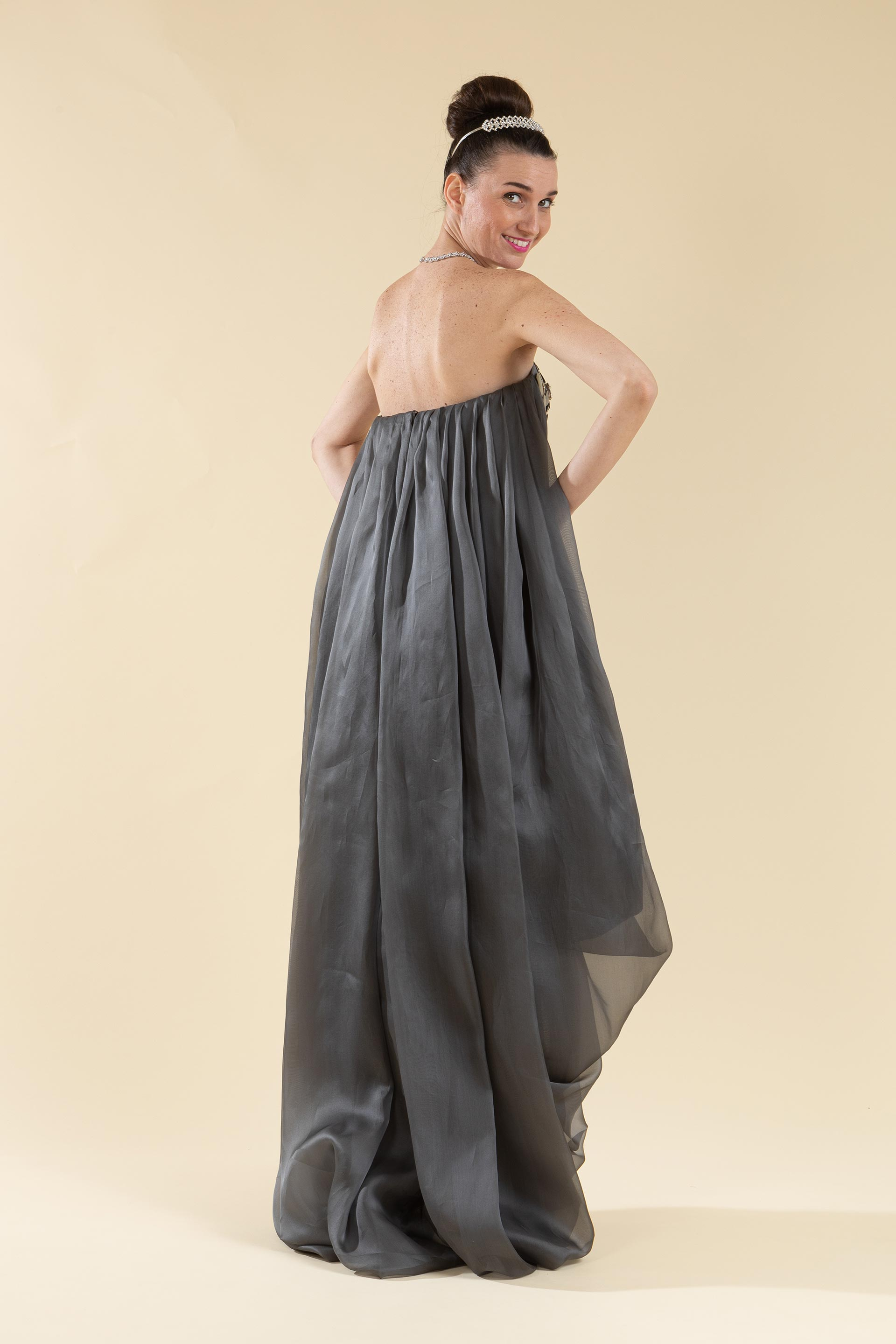 Abito sposa in organza di seta grigio.