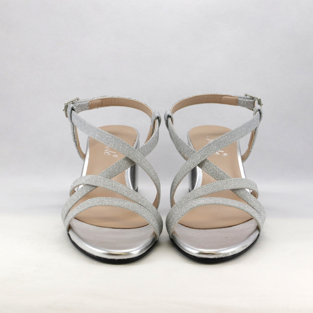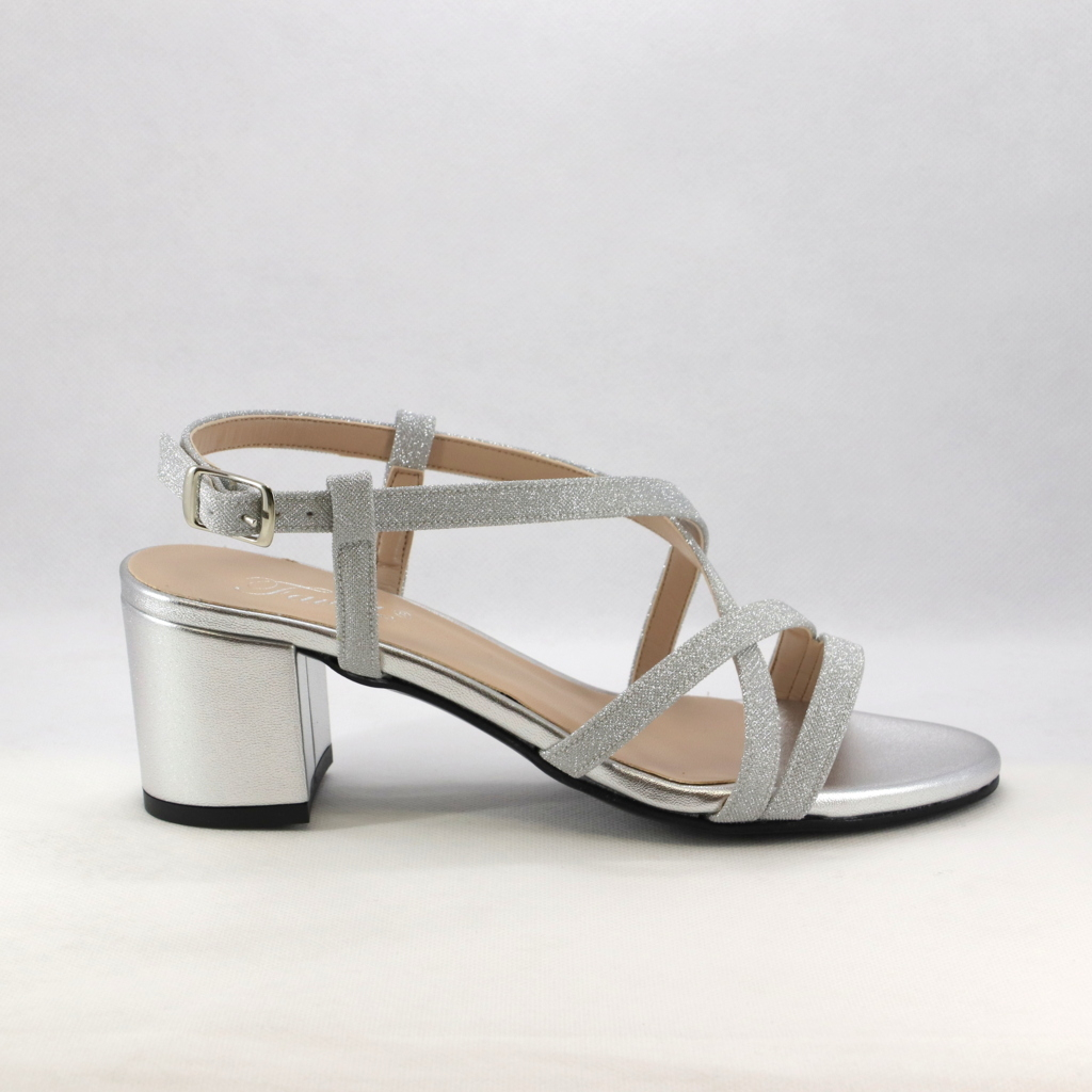 Sandalo cerimonia donna basso realizzato in nappa color argento e micro glitter con cinghietta regolabile alla caviglia e tacco largo.
