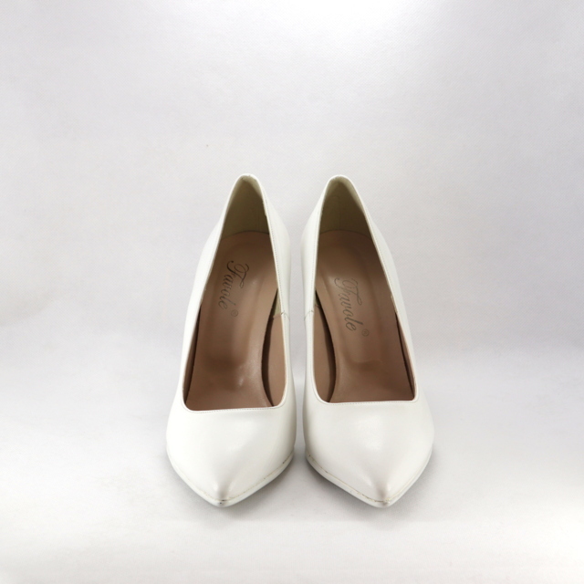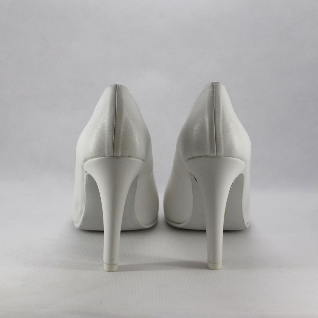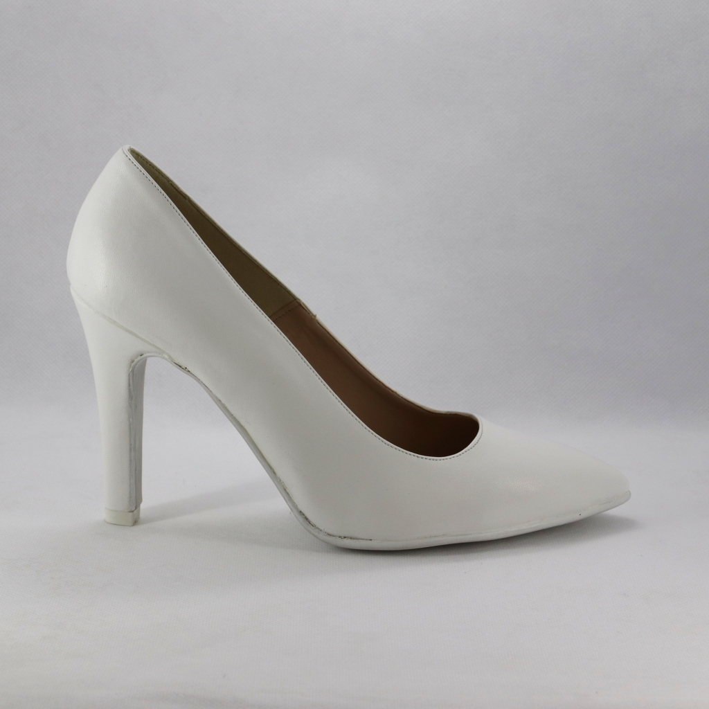 Scarpa bianca di facile abbinamento ai vari outfit, con il tacco alto e la punta sfilata indossata dona un effetto sinuoso alle gambe di chi la indossa.