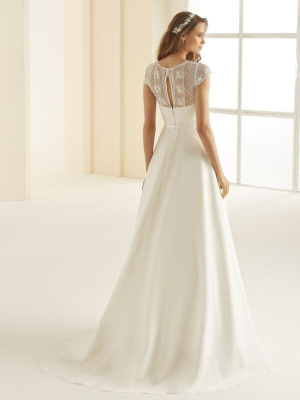 Abito sposa incredibilmente chic realizzato in pizzo boho di alta qualità con gonna realizzata in morbido raso, scollatura a barchetta e delicate trasparenze donano particolarita e originalità al modello.