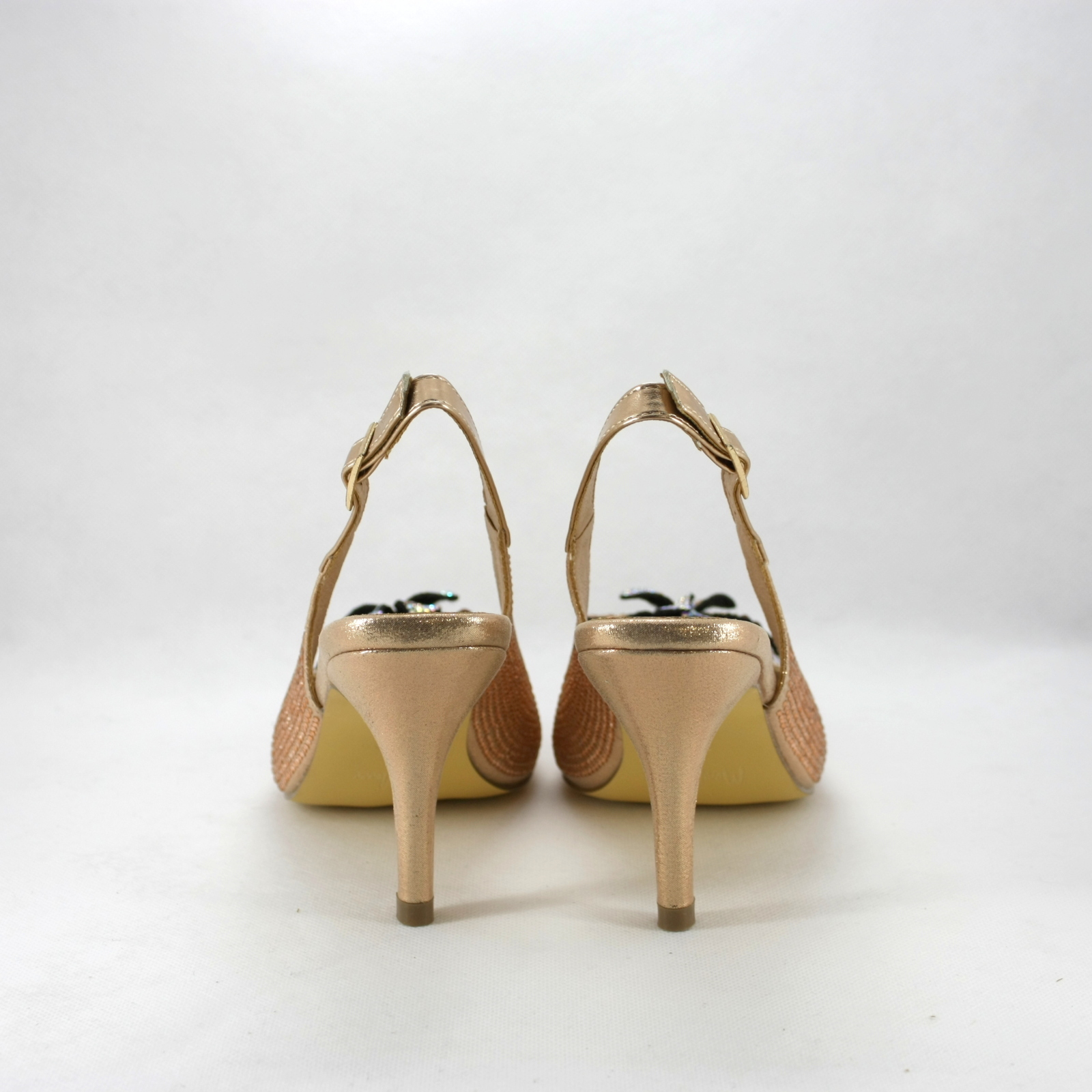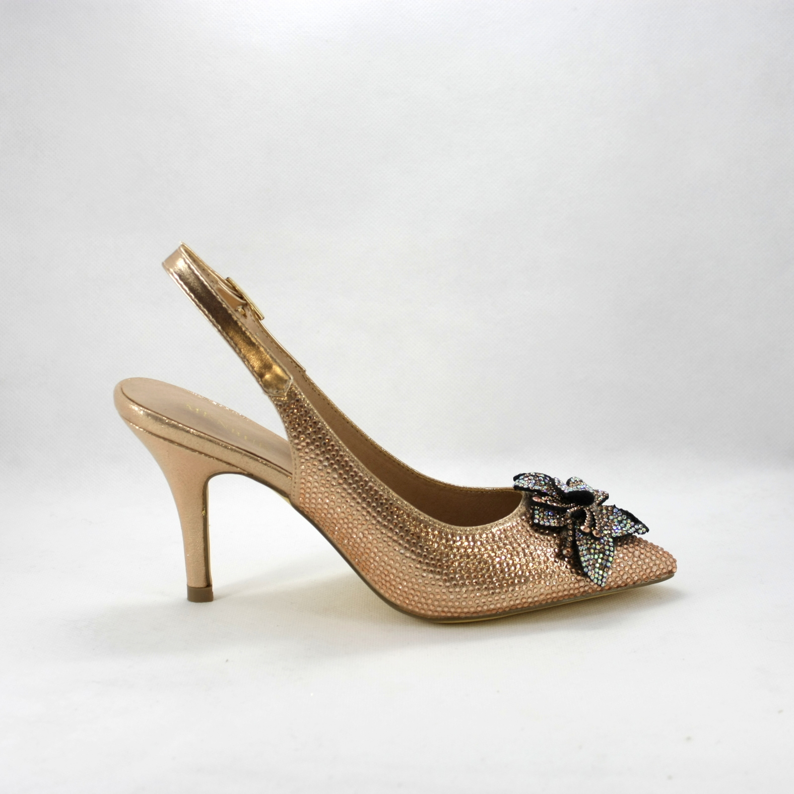 Sandalo cerimonia donna elegante comodo con tacco sfilato realizzato in tessuto glitter luminoso color cipria impreziosito da cristalli e decorato con fiore.