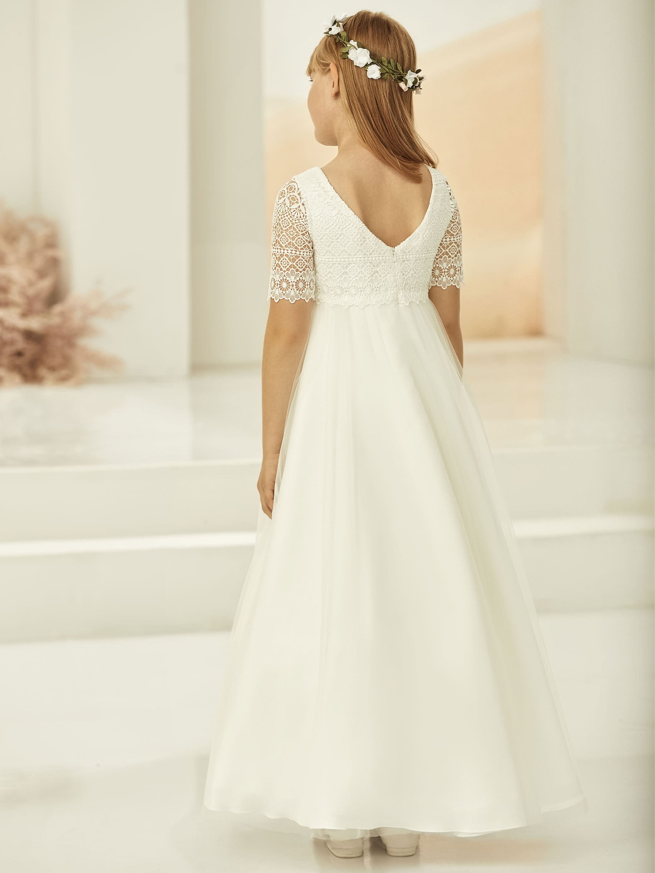 Elegante abito per bimba realizzato con corpetto in pizzo con manichetta corta e gonna in morbido tulle.