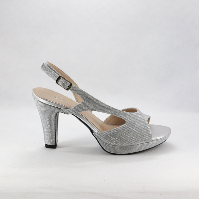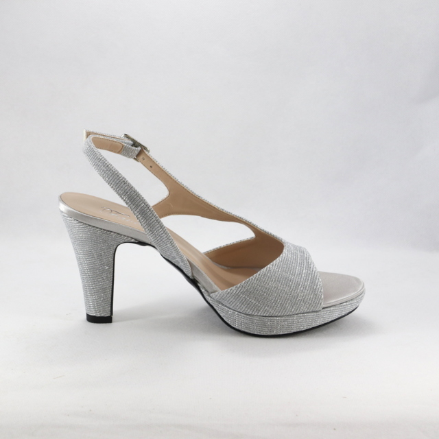 Sandalo cerimonia donna elegante spuntato con cinghetta regolabile alla caviglia, tacco sfilato interamente realizzato in micro glitter argento, il colore base, il tacco con un altezza media ed un comodo plateau rendono questa calzatura molto comoda e di facile abbinamento colore.