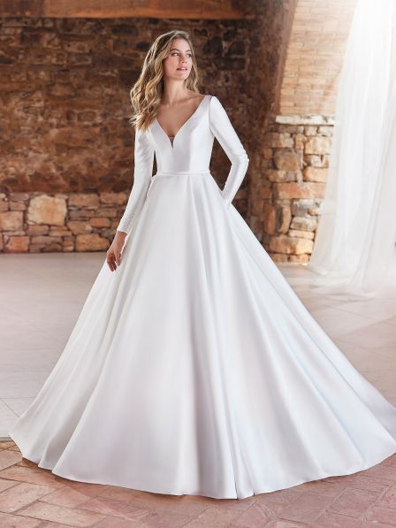 Se quello che cerchi è l'eleganza, questo è l'abito adatto a te! Realizzato a mano in setoso mikado con maniche lunghe e una gonna ampia in stile principessa.