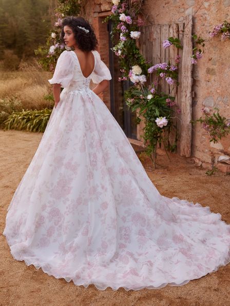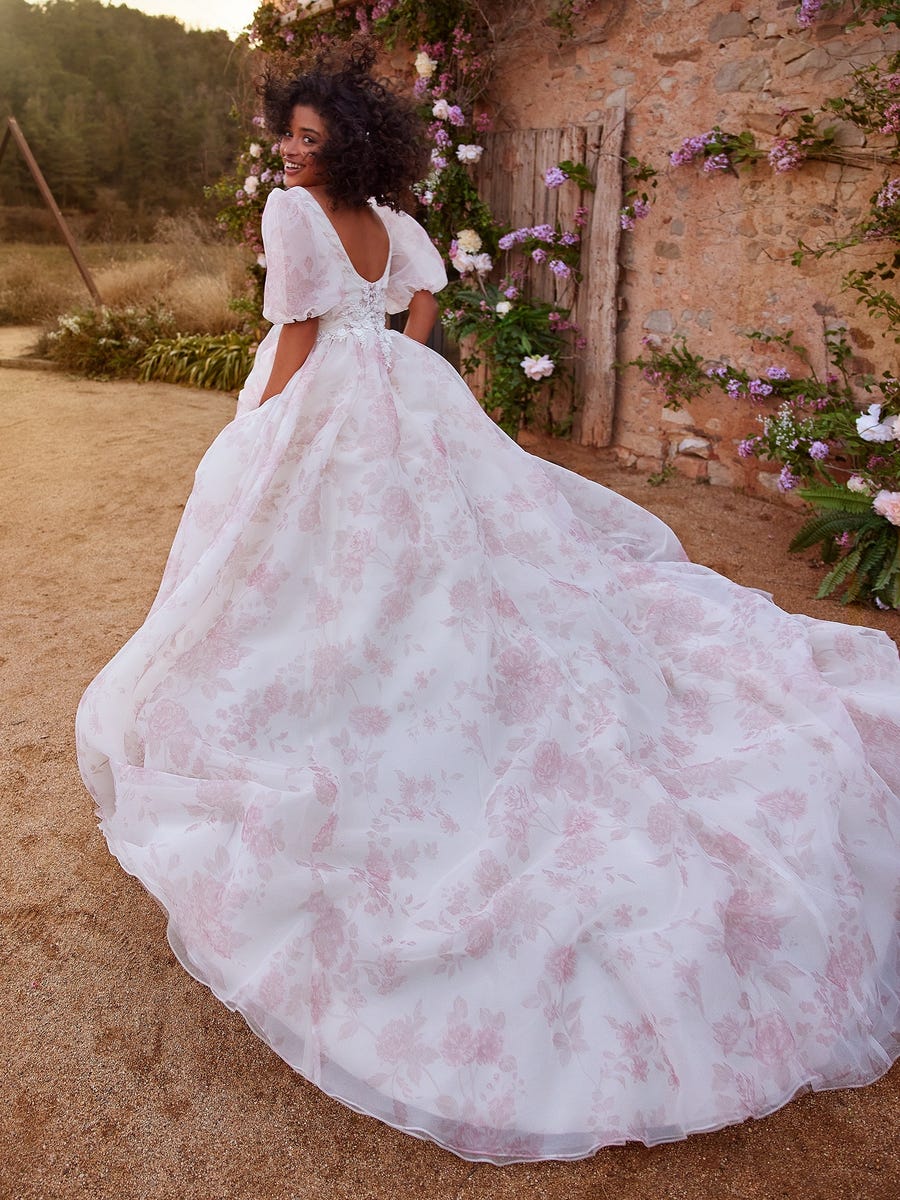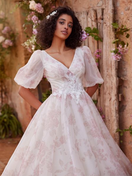 Abito sposa per chi ha il coraggio d'essere diversa e distinguersi in modo originale, interamente realizzato in organza a fantasia floreale con maniche a sbuffo e impreziosito da applicazioni di pizzo in vita.