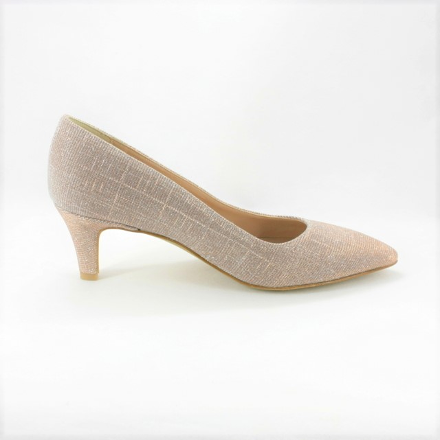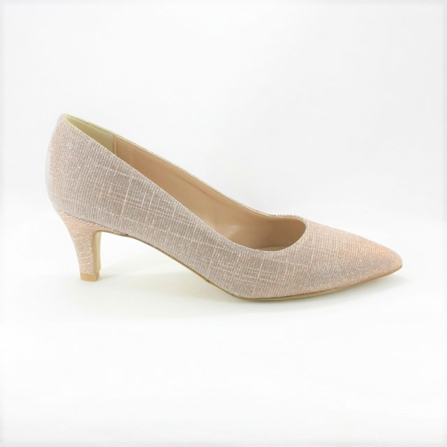 Scarpa cerimonia donna elegante sfilata con tacco basso interamente realizzata in micro glitter rosa luminoso.