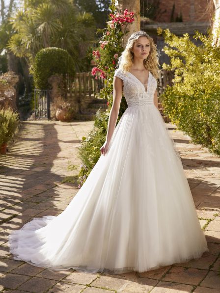 Abito sposa realizzato con due tessuti incredibili, tulle e pizzo di fondono per dare forma a un meraviglioso abito da sposa in stile principessa. Un abito dalle linee classiche che, con maniche corte e scollatura a V che rompe con la tradizione puntando su una schiena a oblò di grande tendenza.