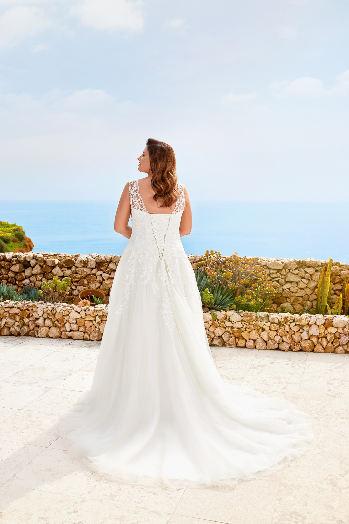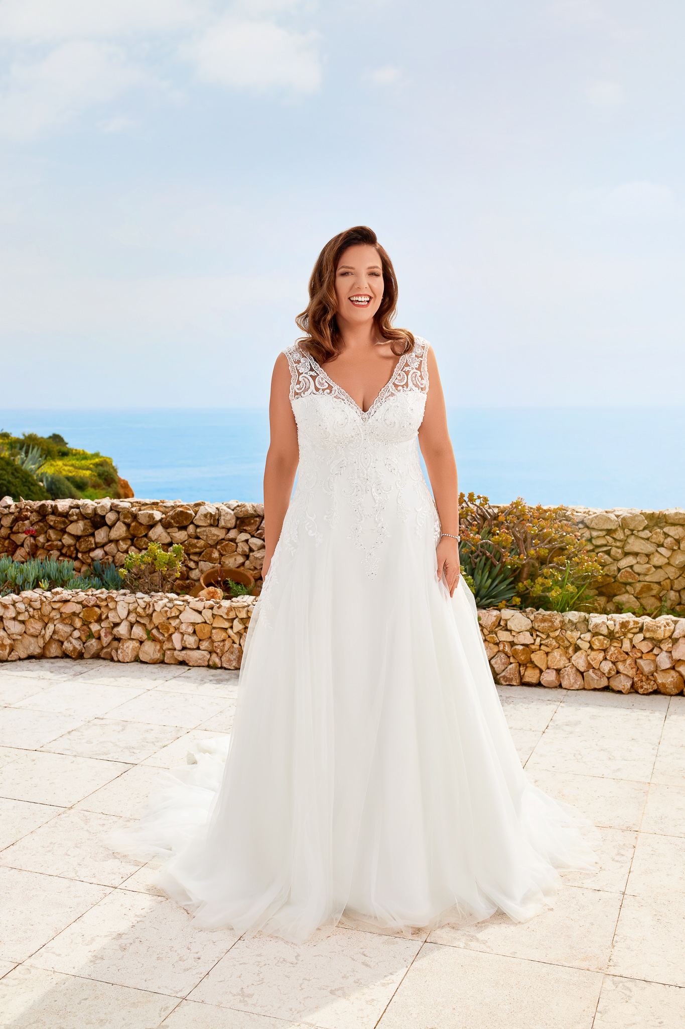 Abito sposa curvy dalla linea semi sirena con scollo a V in pizzo effetto tatoo e chiusura a laccetti.
