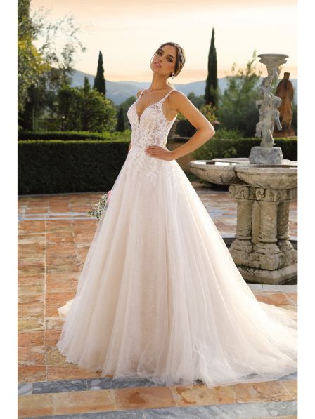 Abito sposa ampio realizzato con corpetto in pizzo luminoso e gonna in pizzo e tulle nei toni del pesca e avorio.