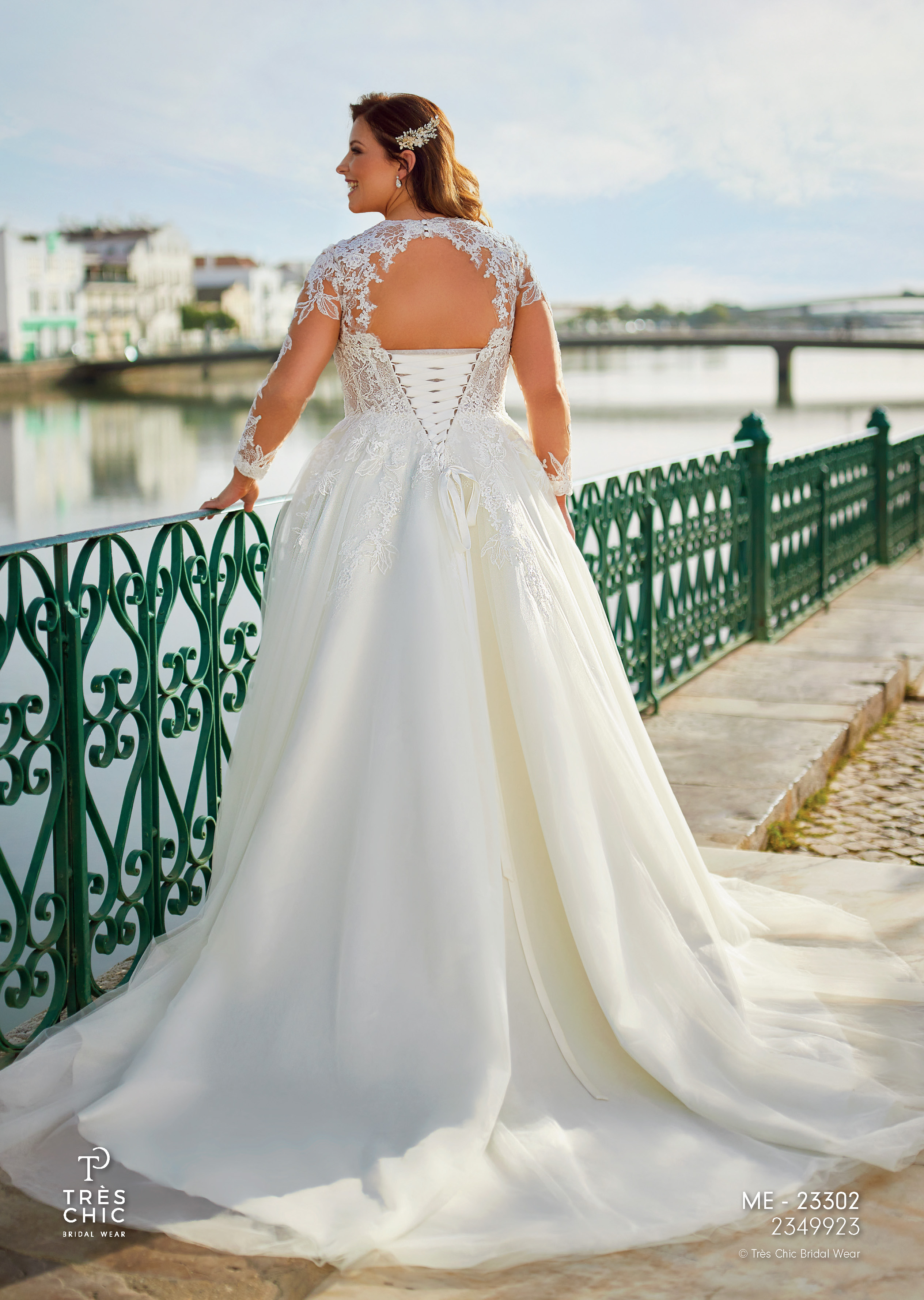 Abito sposa curvy realizzato in tessuto di tulle con corpetto in pizzo e manica lunga effetto tatoo e chiusura a laccetti.
