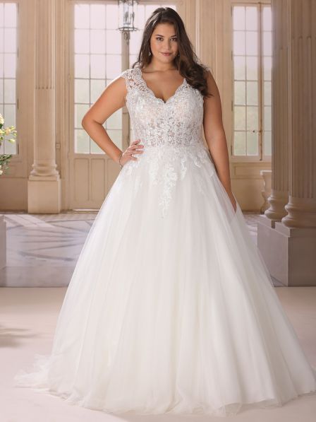 Abito sposa curvy dalla linea ampia in tulle con corpetto in pizzo ricamato.