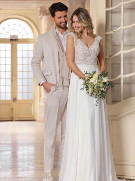 Abito sposa dalla linea scivolata realizzato con corpetto in pizzo scollato a V e gonna morbida in chiffon impreziosito da delicati bottoncini foderati.