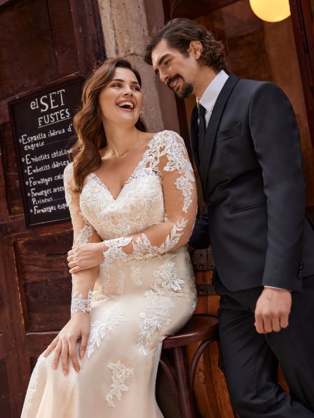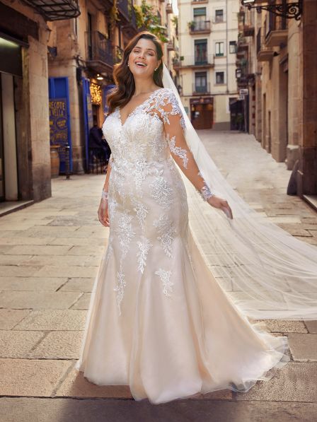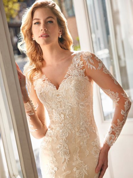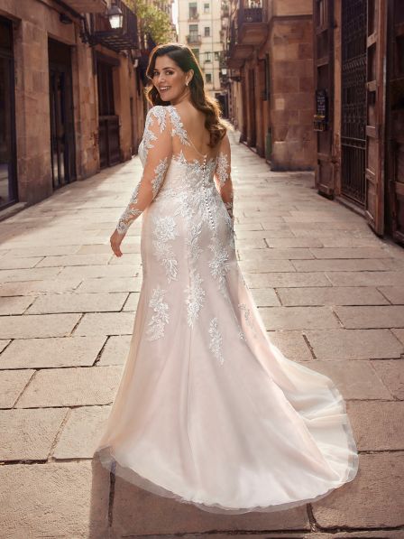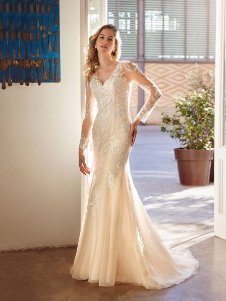 Abito sposa dalla linea a sirena realizzato in pizzo e tulle con maniche lunghe.