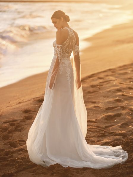 Particolare abito sposa con scollatura all'americana e manicotti in tulle e pizzo.