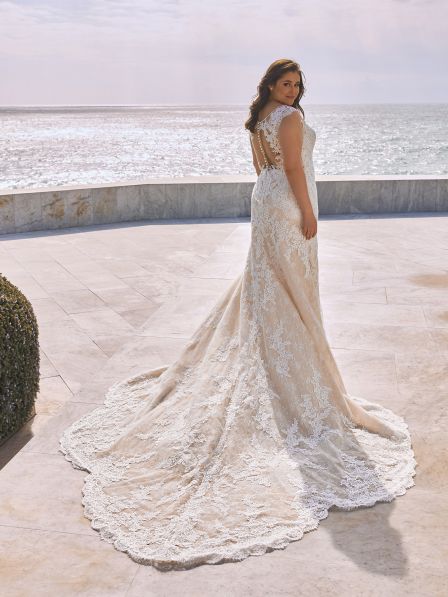 Spettacolare abito da sposa a sirena in pizzo con coda a cappe.