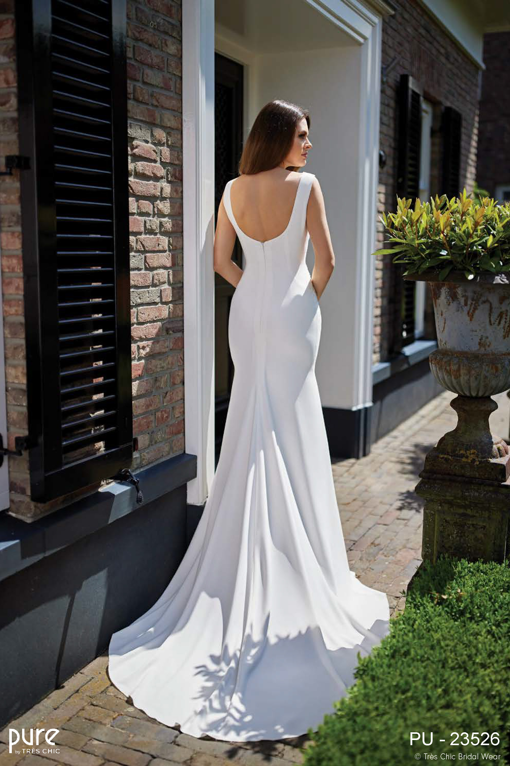 Abito sposa a sirena realizzato in tessuto di cady con scollatura a barchetta davanti e profonda scollatura sulla schiena, impreziosito da applicazioni in pizzo.