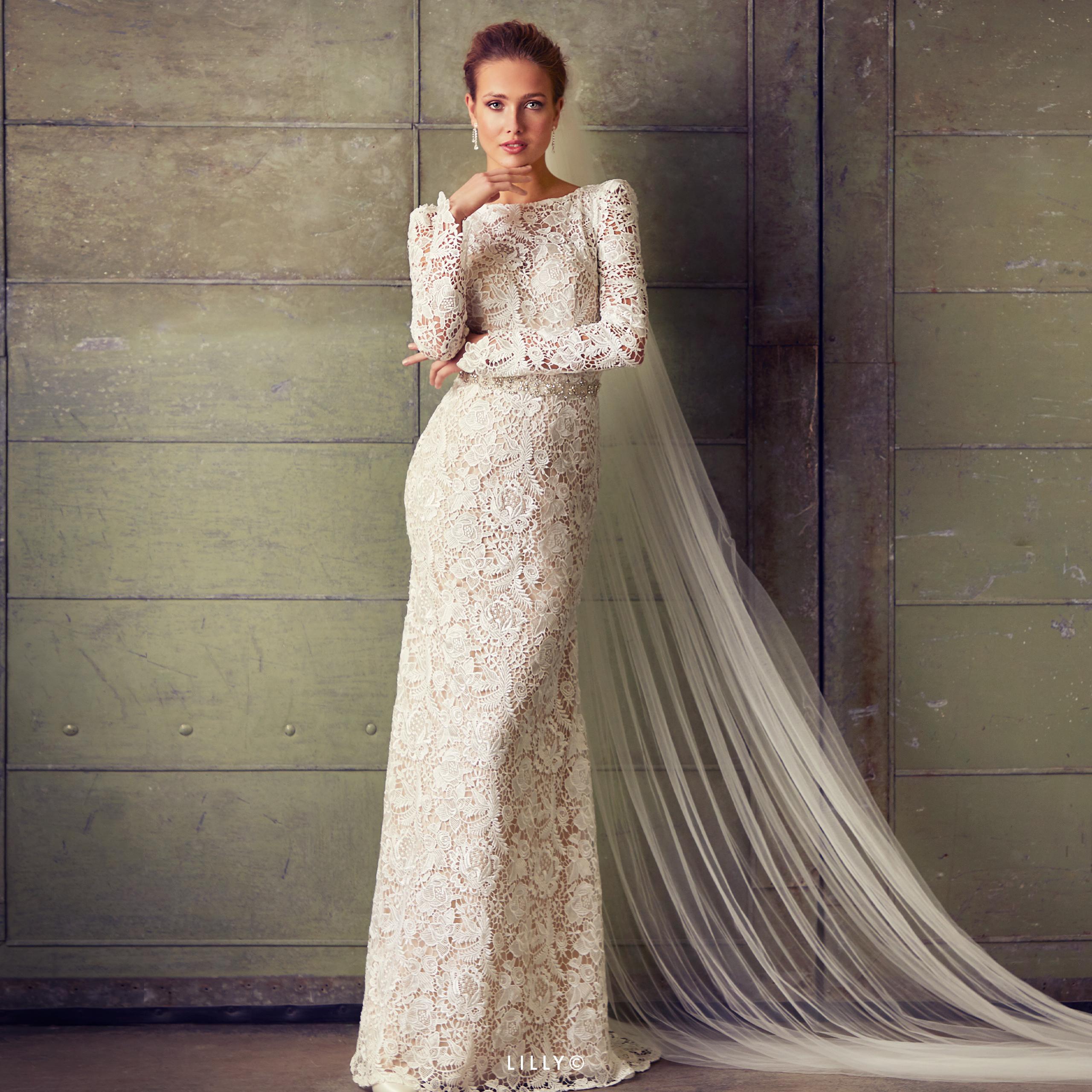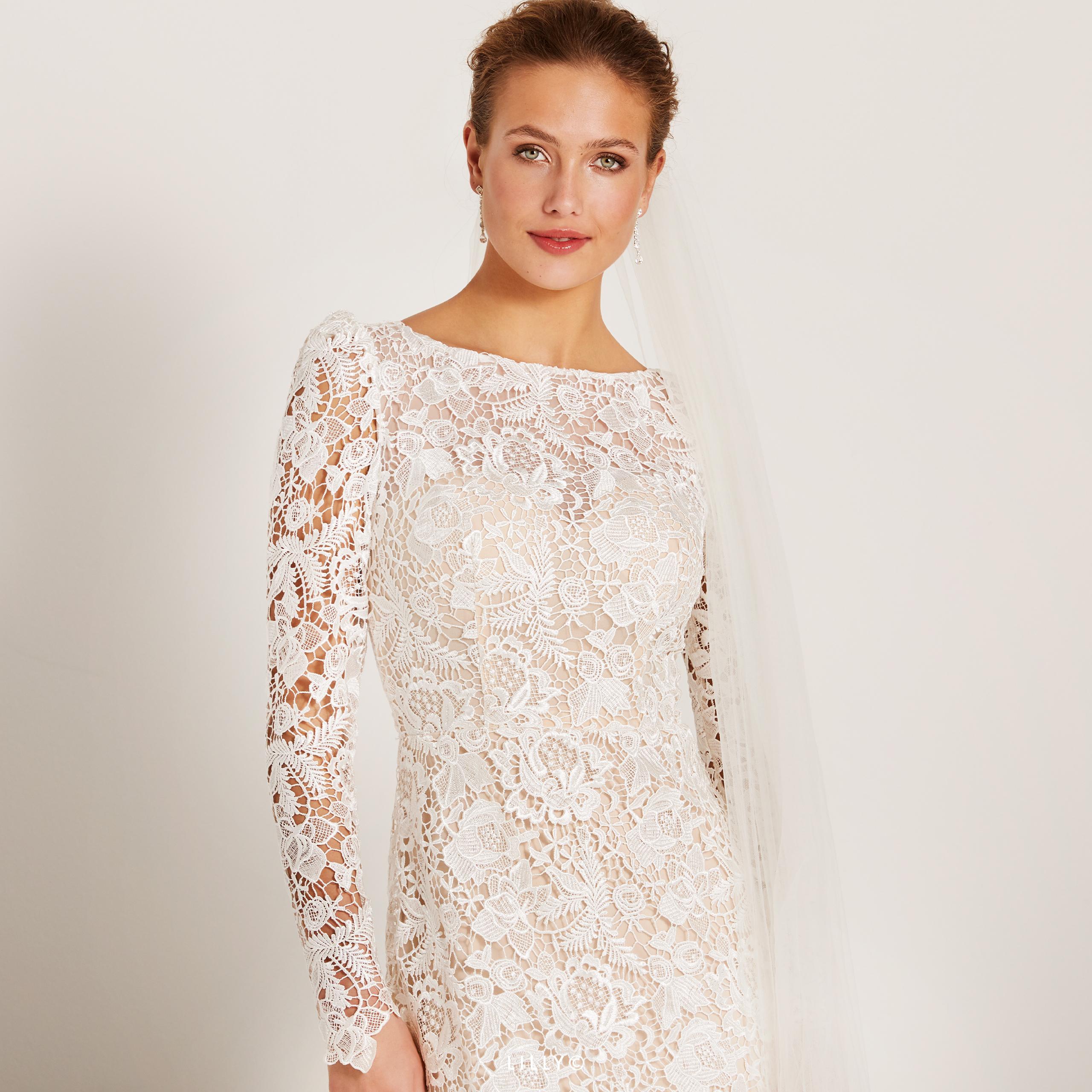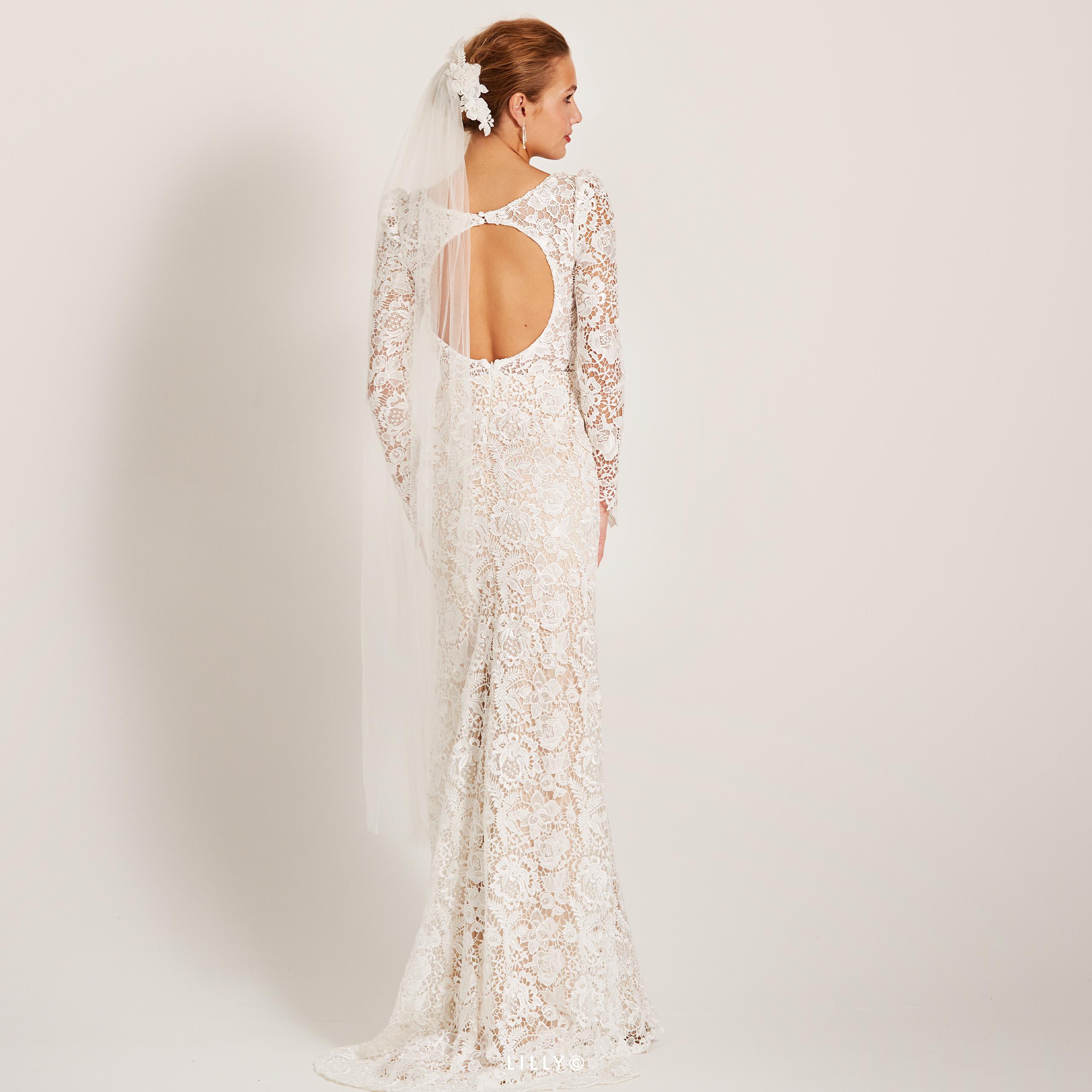 Abito sposa interamente realizzato in pizzo macramè dalla linea aderente con effetto pizzo a contrasto, impreziosito dalla scollatura particolare ad oblò sulla schiena.