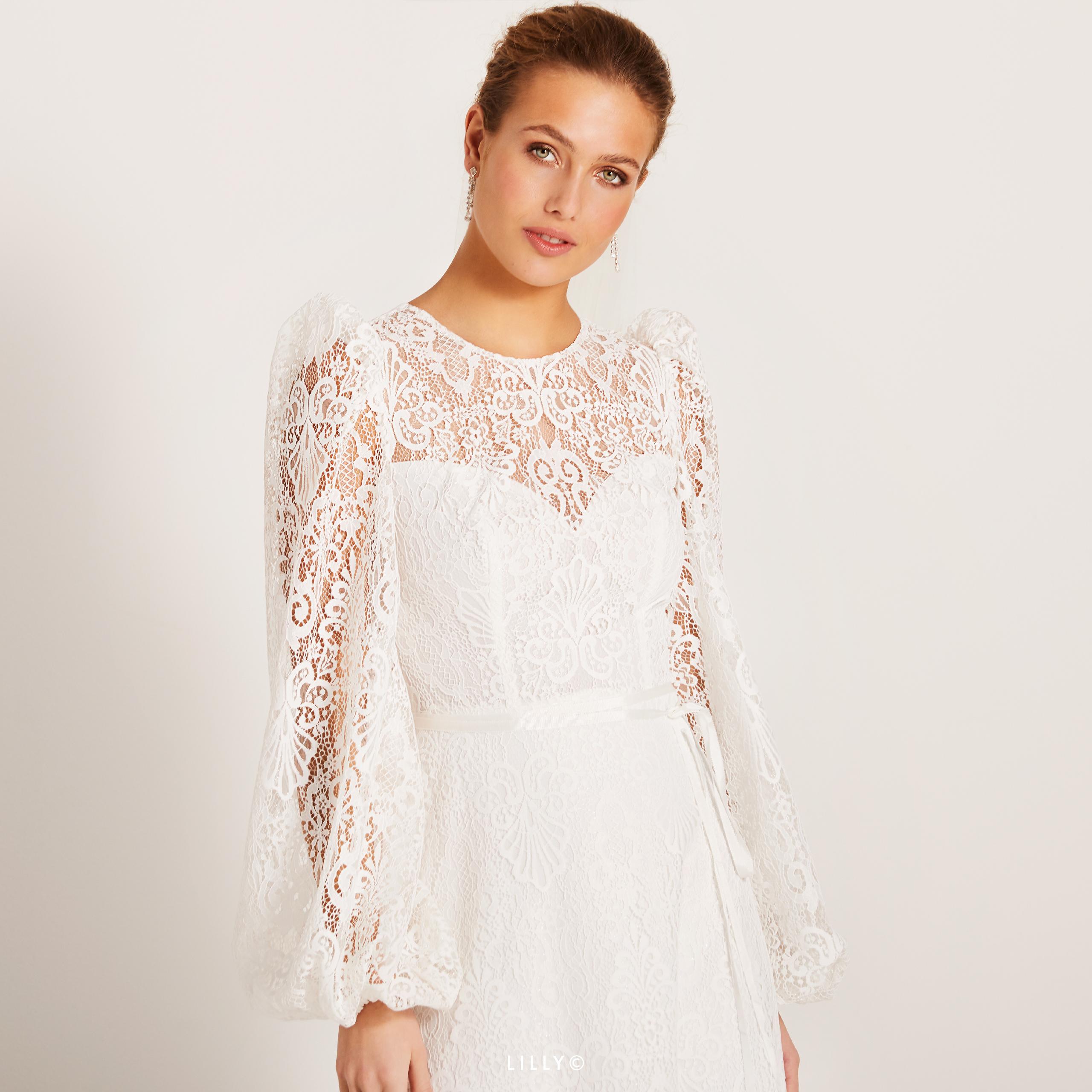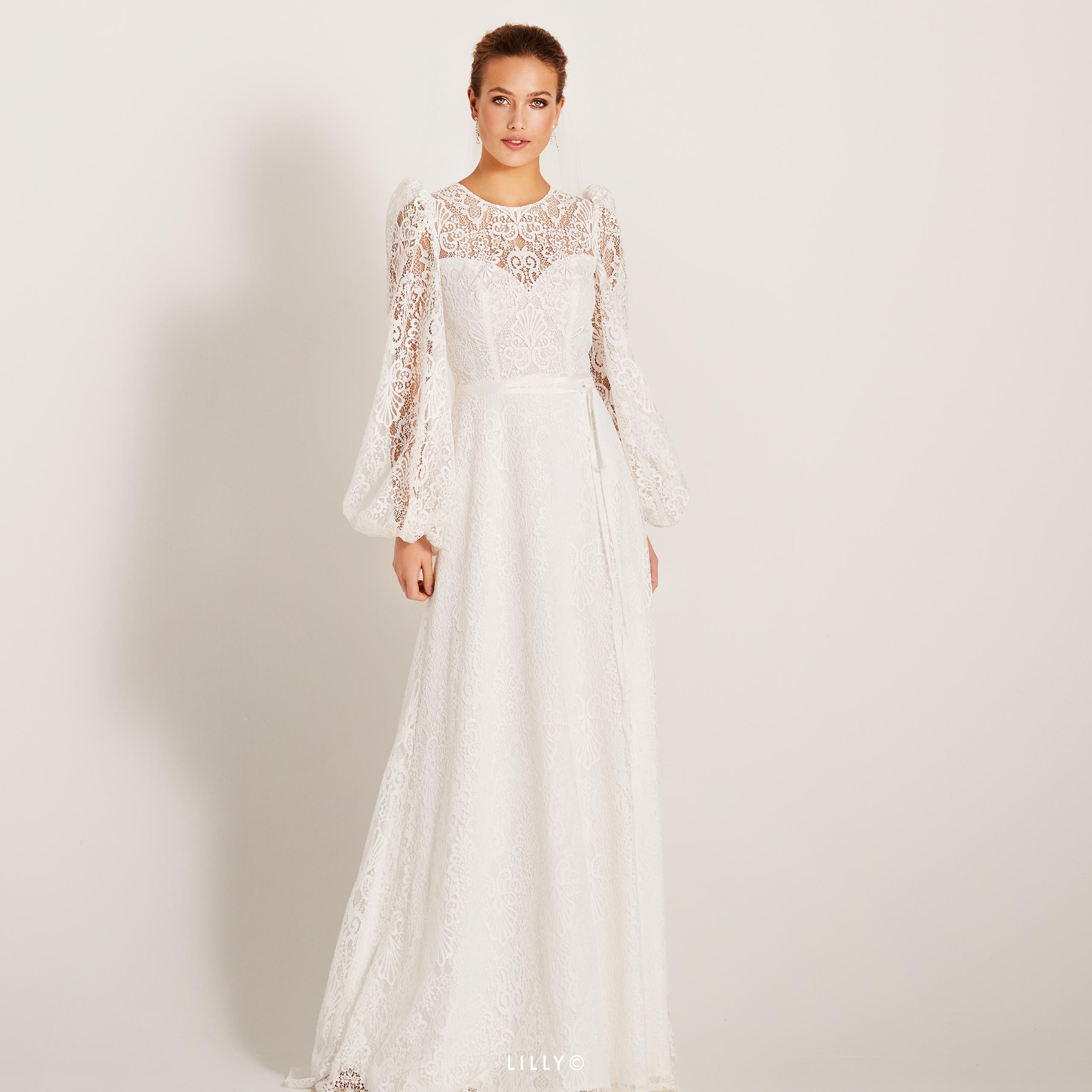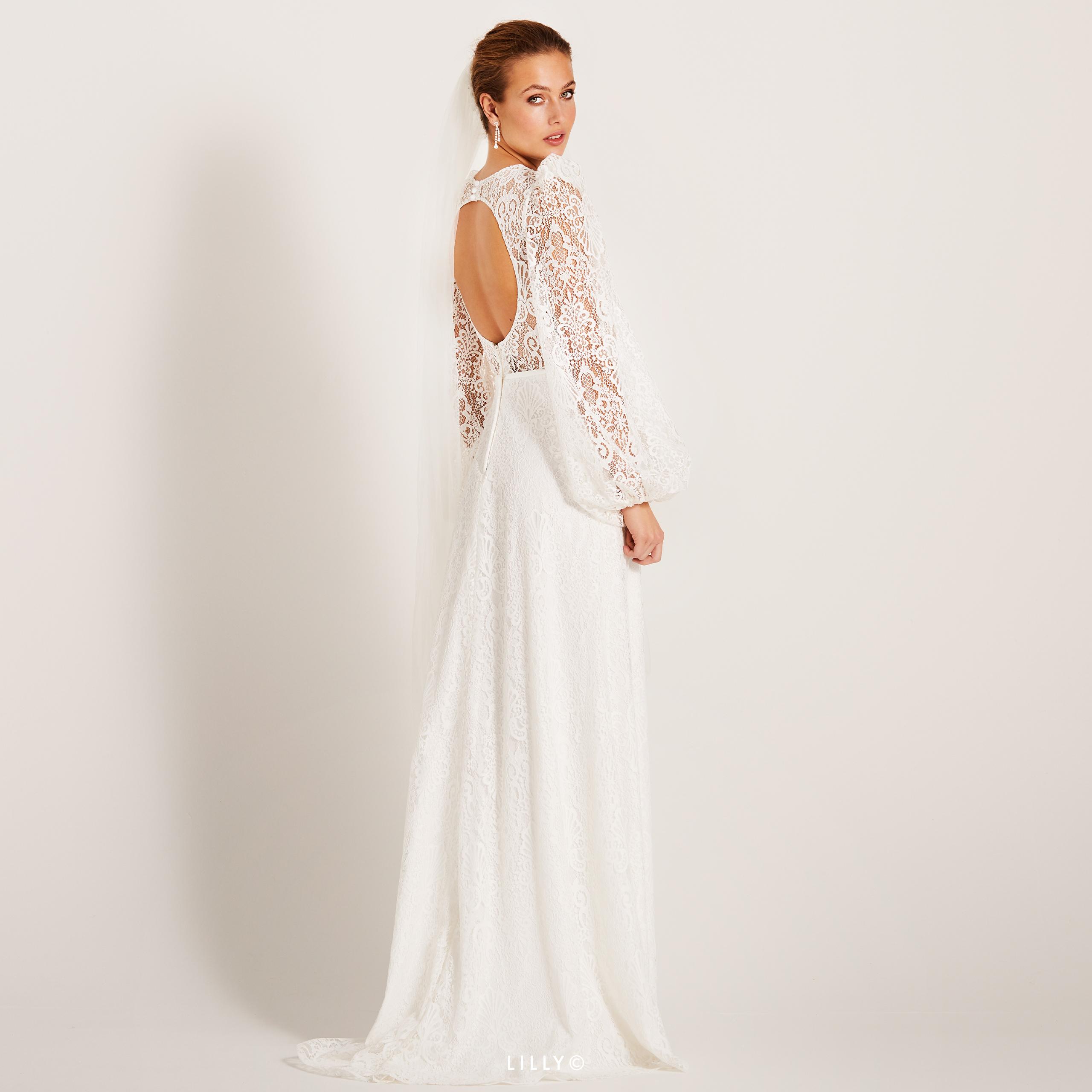 Abito sposa interamente realizzato in pizzo dalla linea svasata, impreziosito dalla scollatura particolare ad oblò sulla schiena e da maniche lunghe a palloncino.