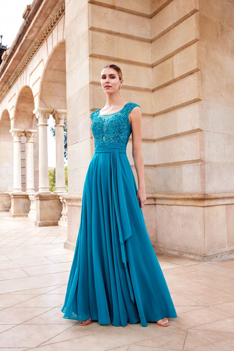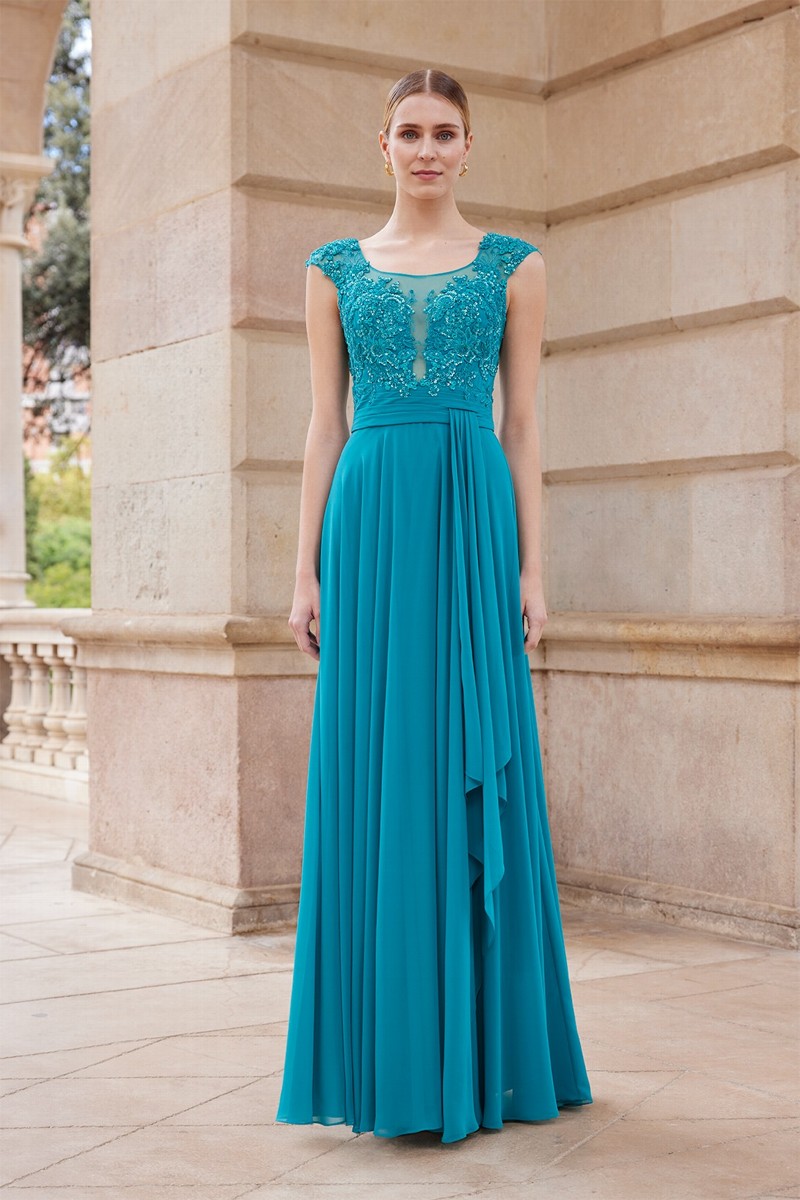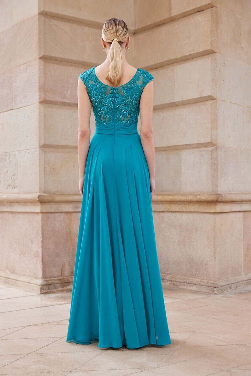 Abito cerimonia donna lungo realizzato in tessuto morbido di voile con corpetto di pizzo ricamato in trasparenza color verde petrolio.