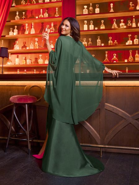 Abito cerimonia donna lungo realizzato in tessuto di mikado luminoso verde bottiglia dalla linea a sirena a décolleté drappeggiato con spacco; completo di mantella morbidissima realizzata in tessuto di chiffon con polsi.