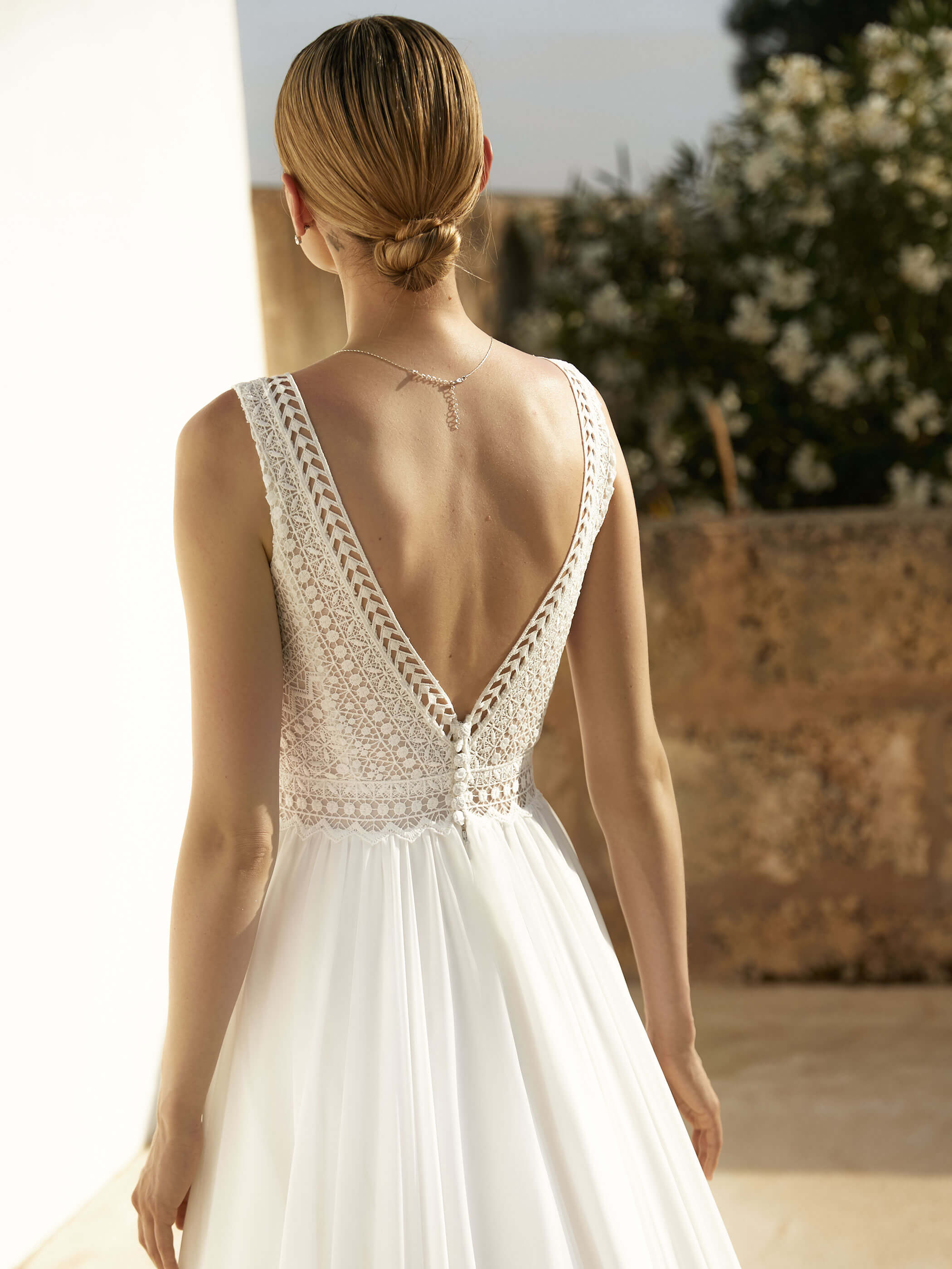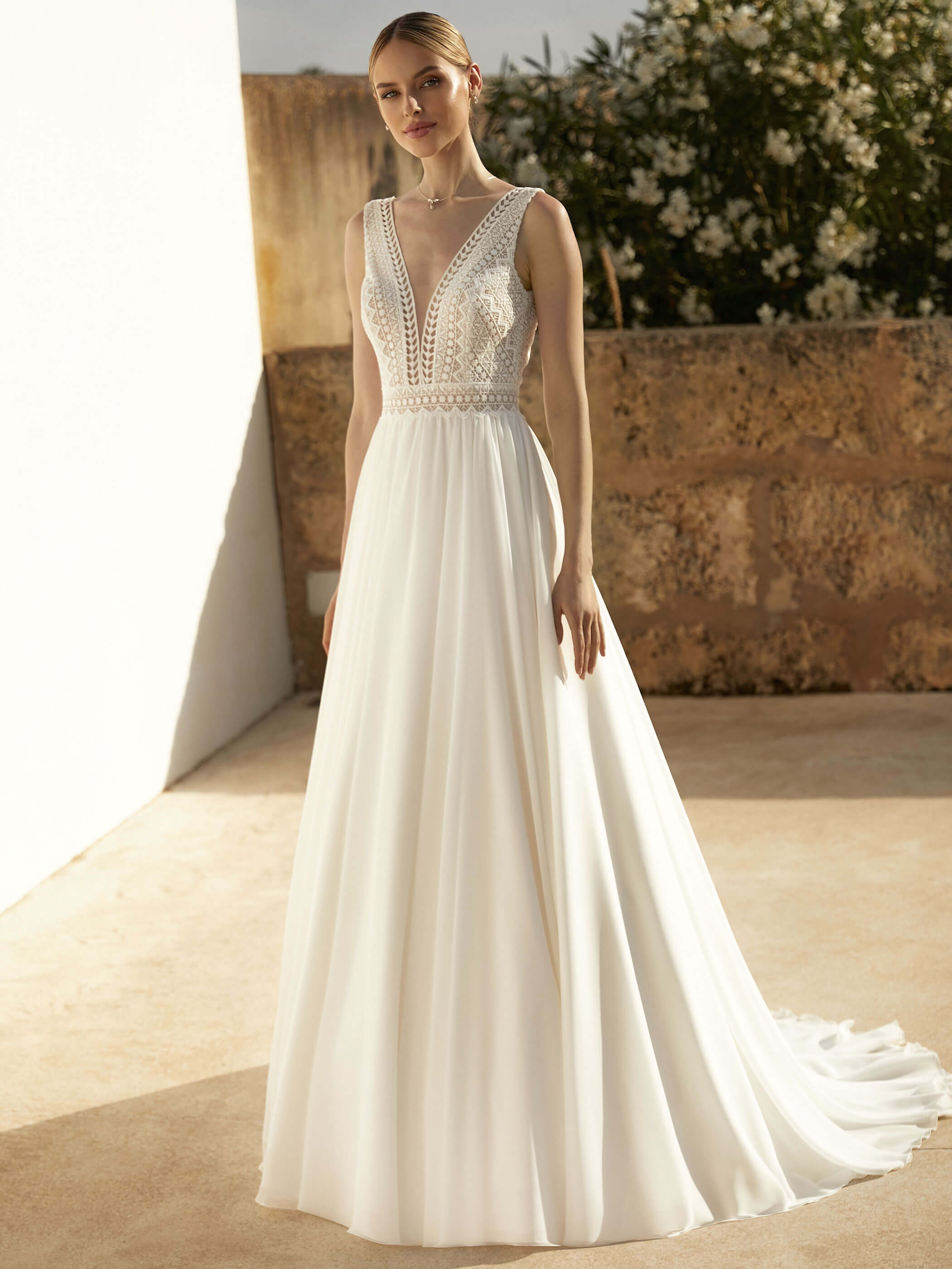 Abito da sposa scivolato realizzato con corpetto in pizzo bohémien dallo stile shabby e morbidissima gonna in chiffon con scollo a V.