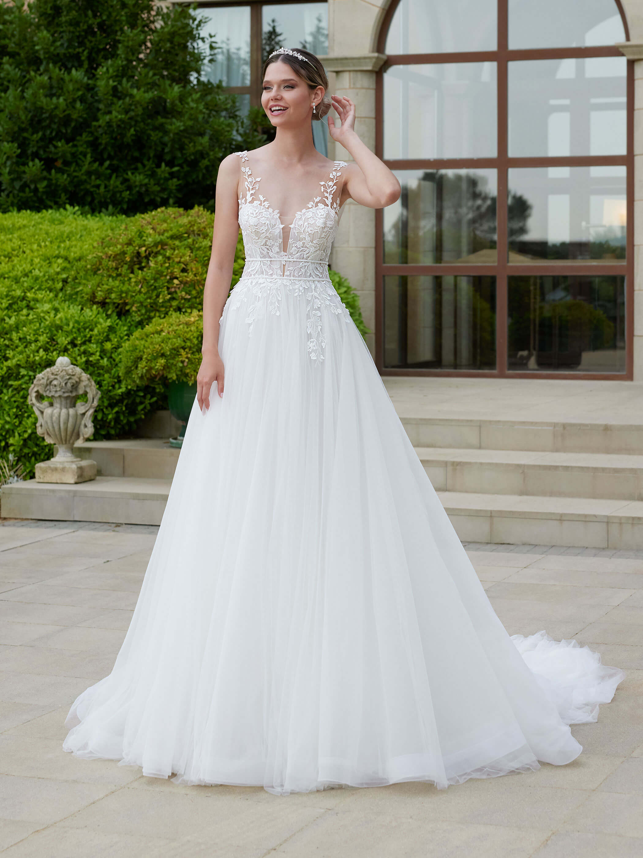Abito sposa ampio dallo stile romantico con corpetto in pizzo in trasparenza impreziosito da ricamo luminoso e gonna in tulle con coda.