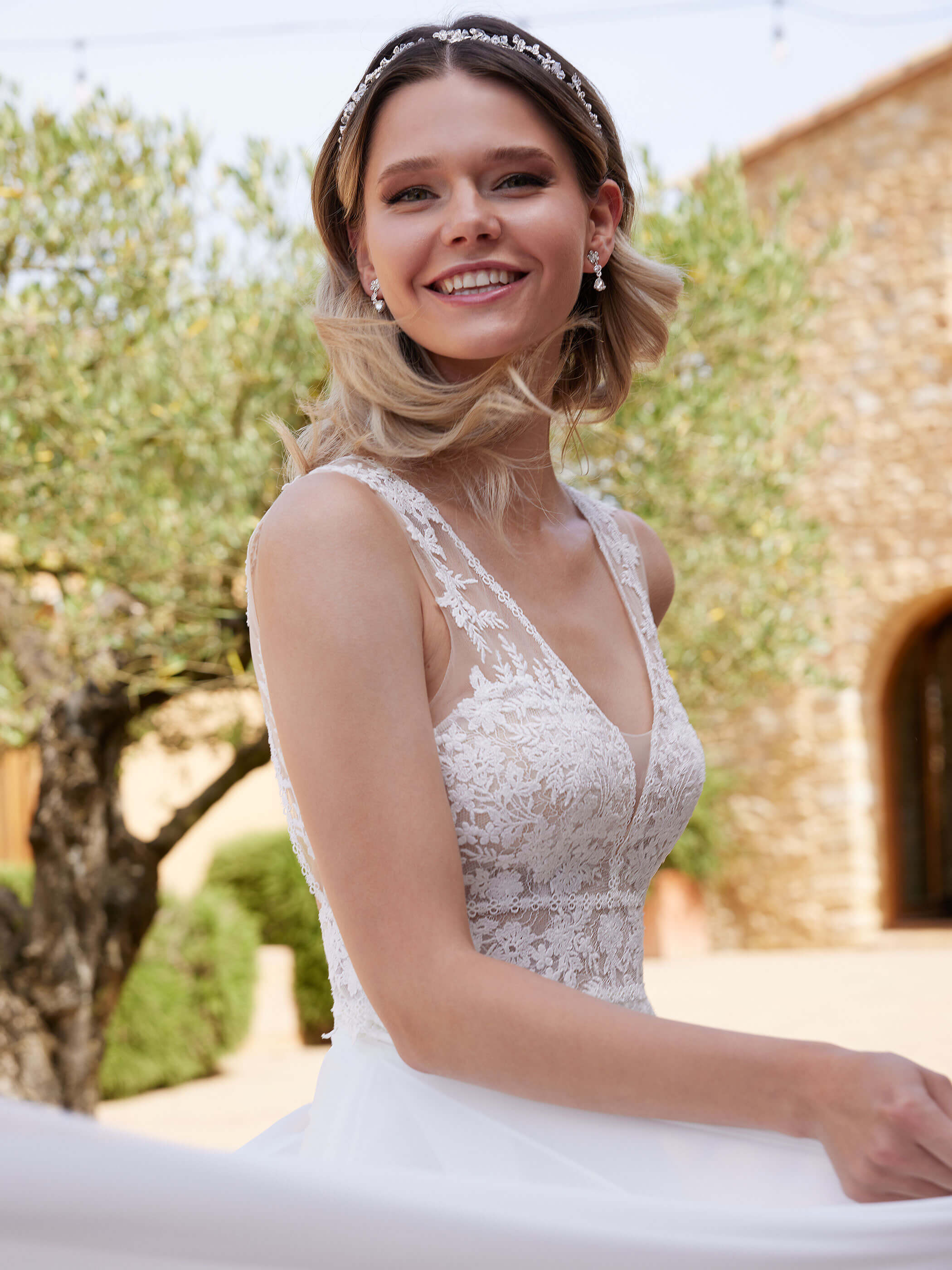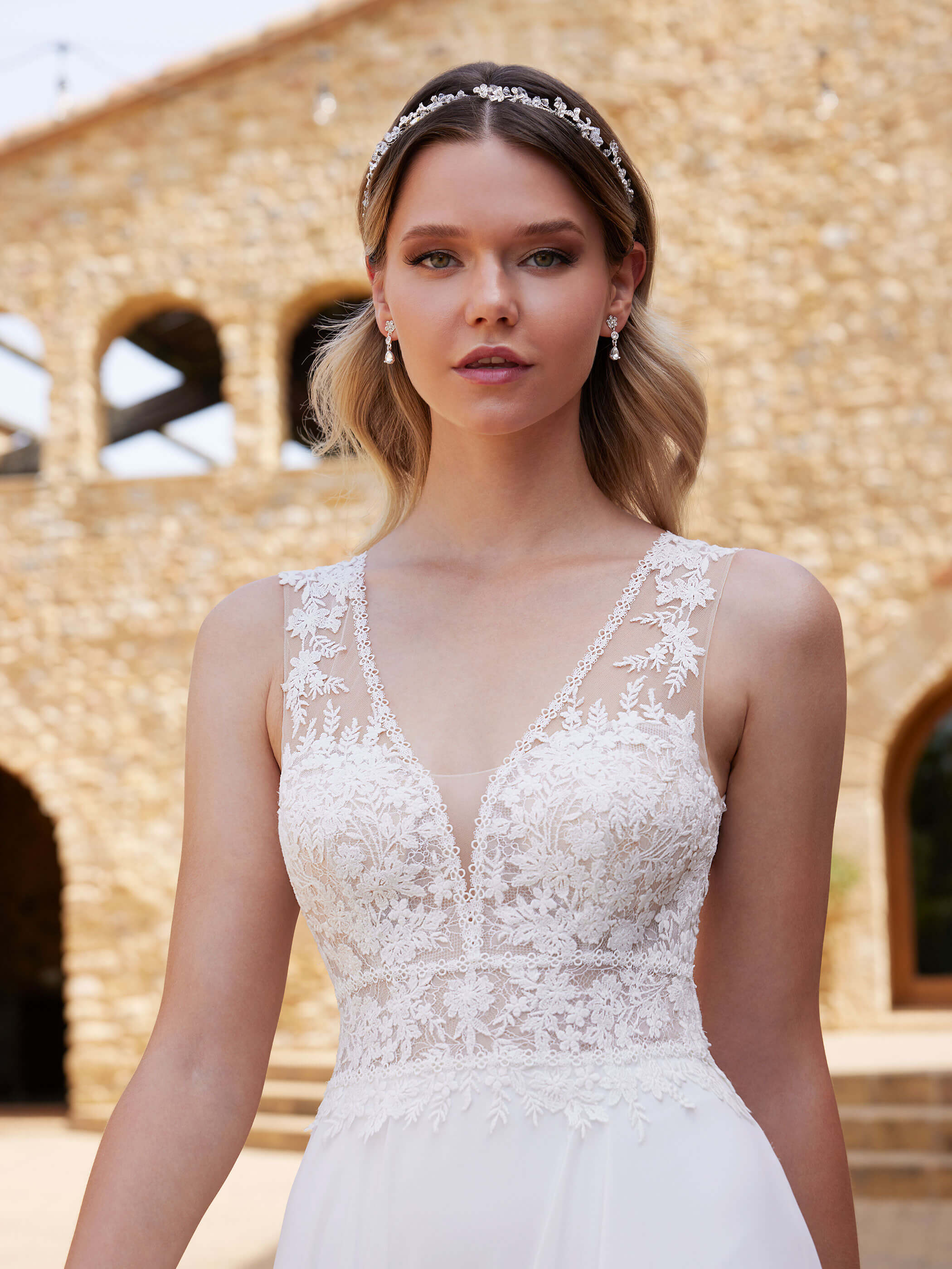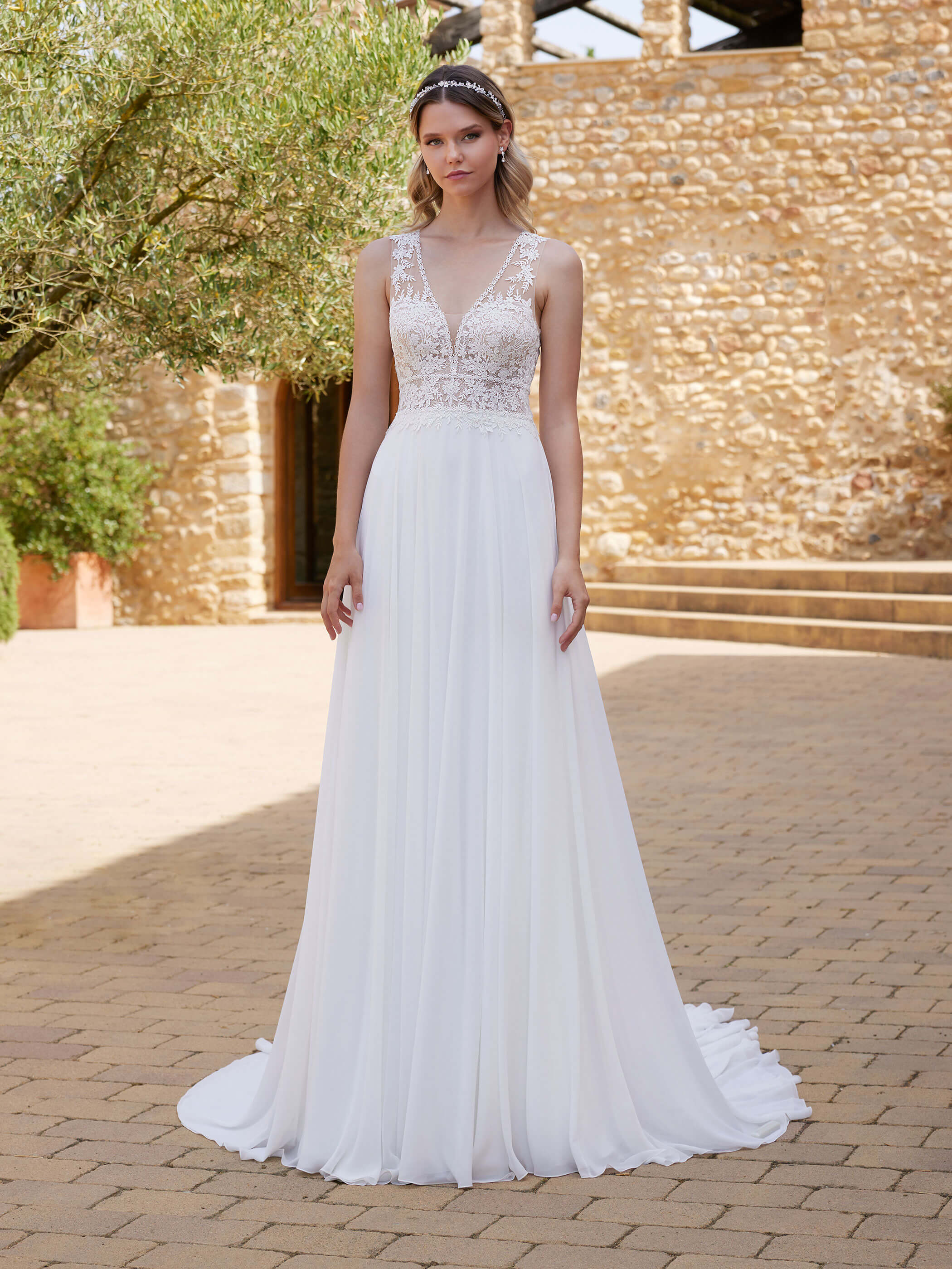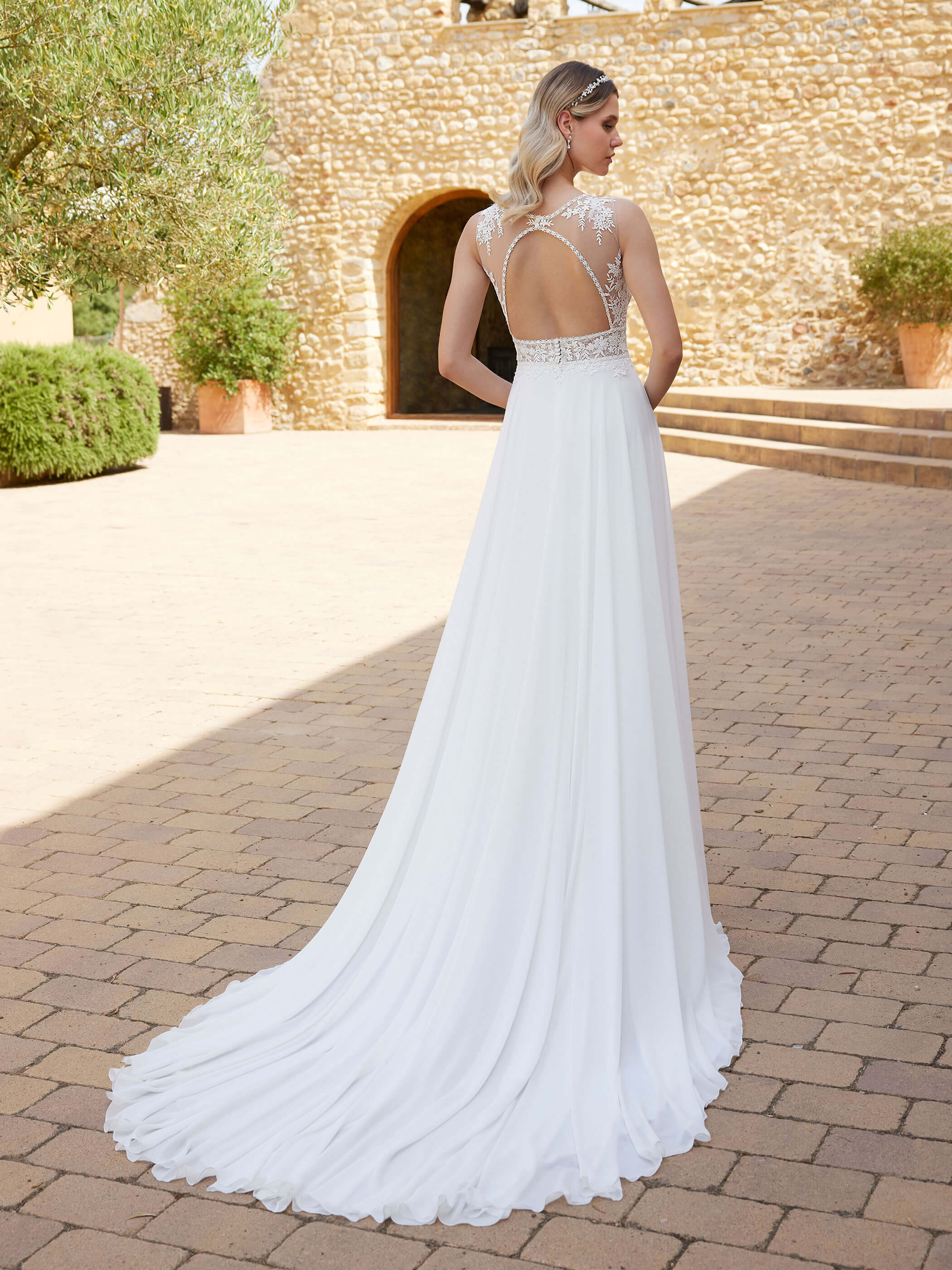 Abito sposa con corpetto in pizzo in trasparenza e scollatura particolare sulla schiena realizzato con gonna in morbido chiffon.