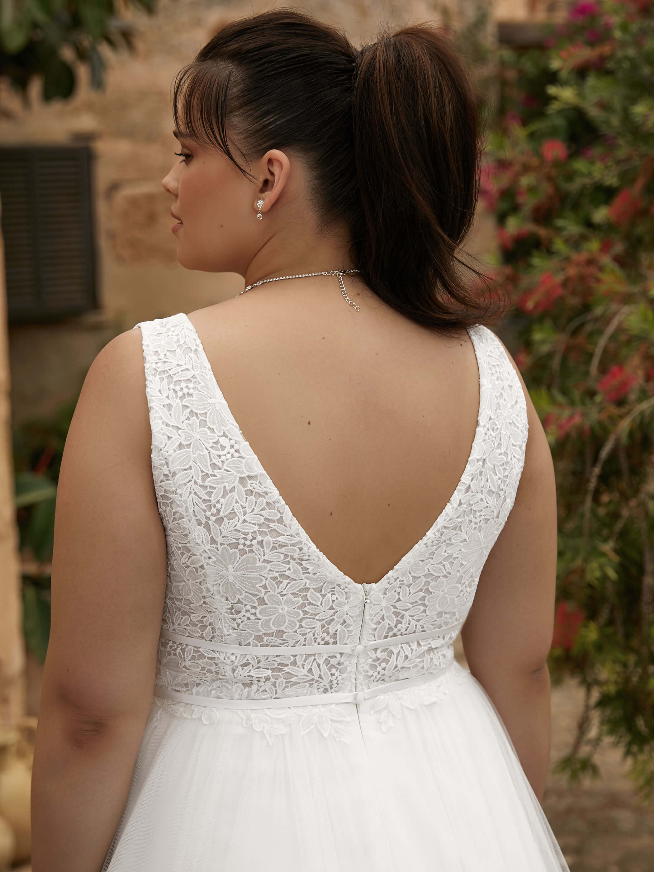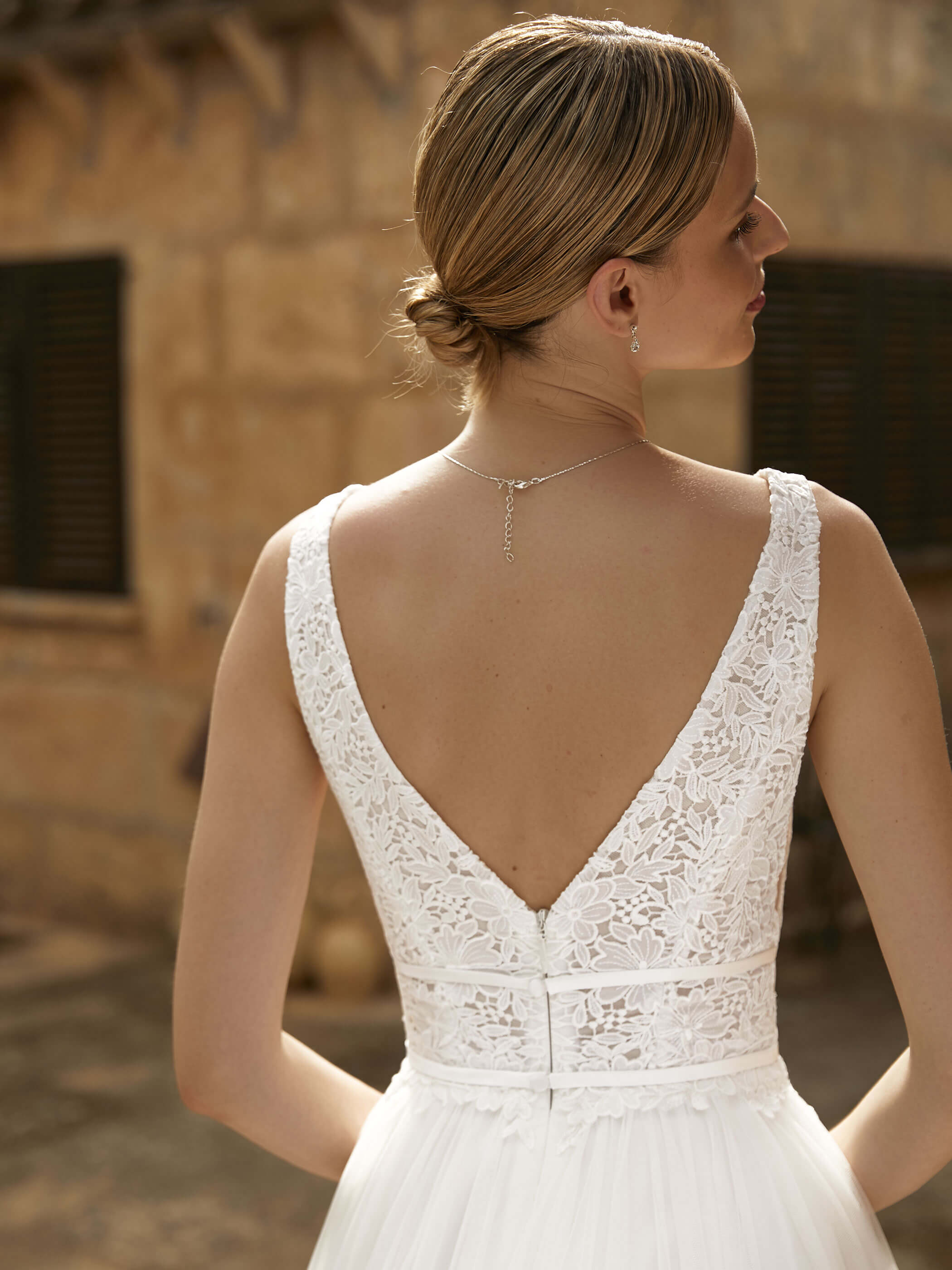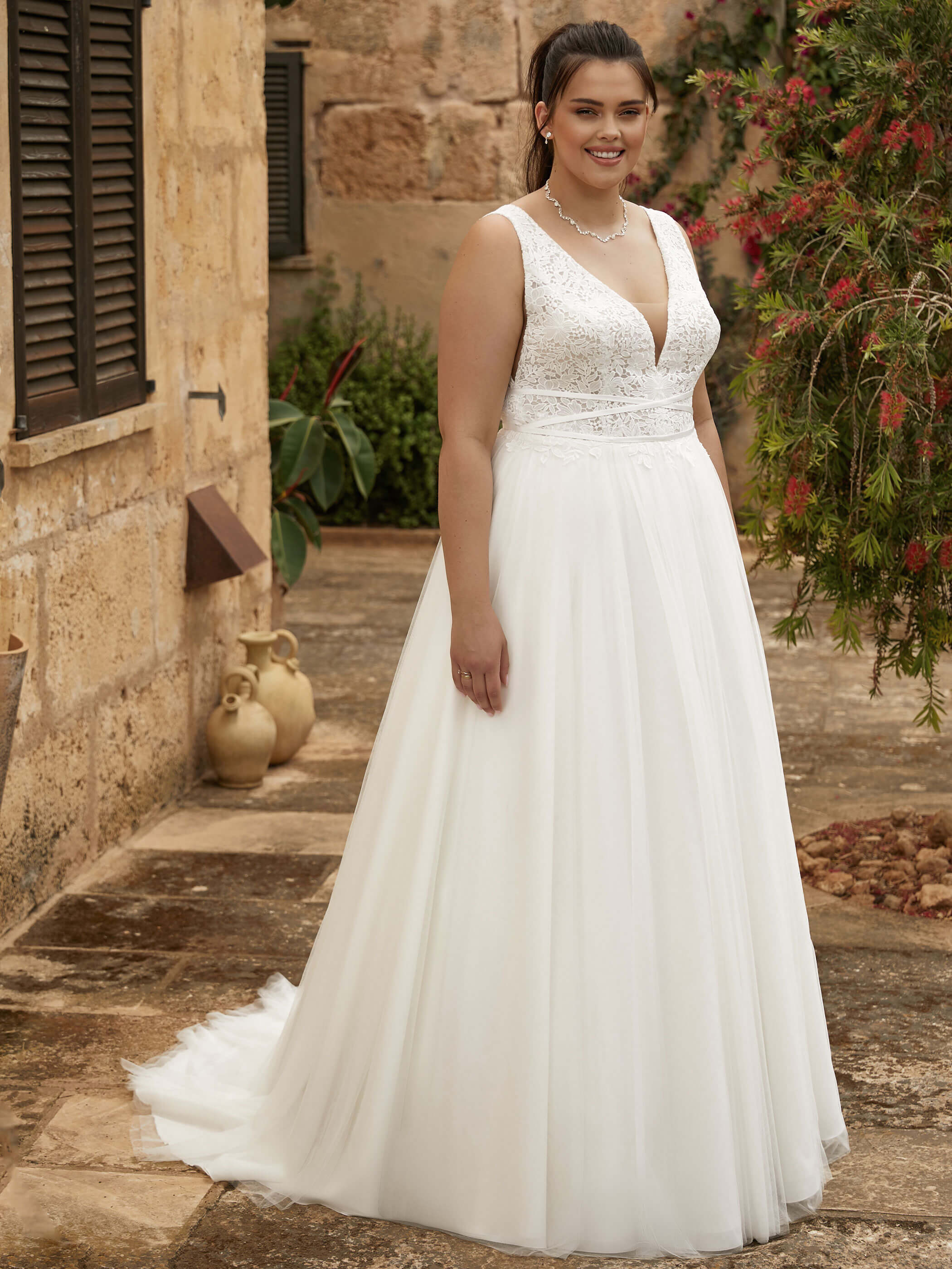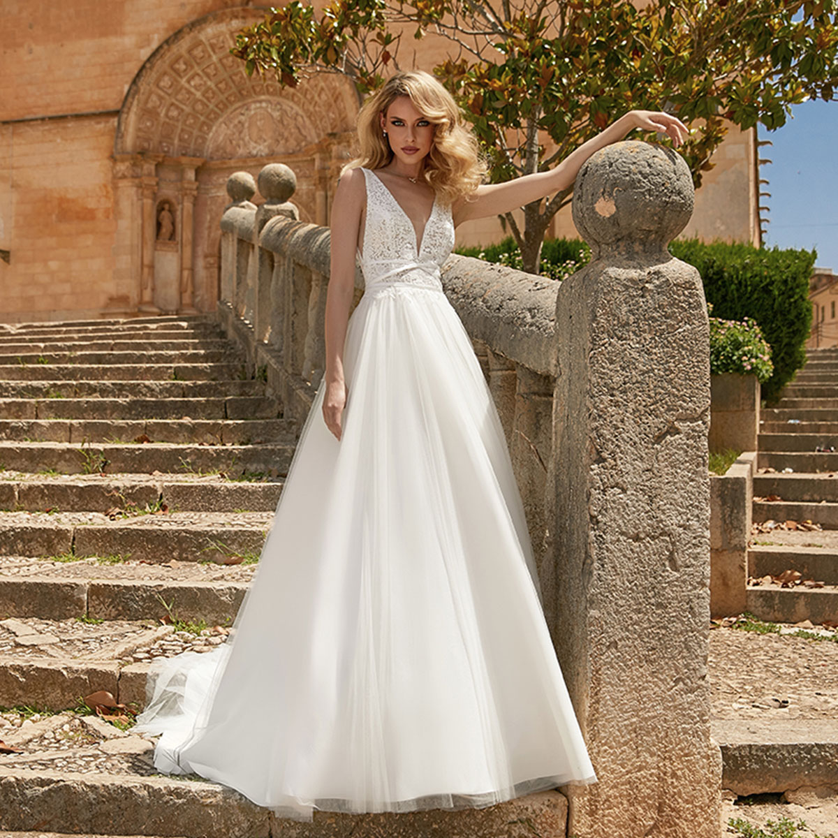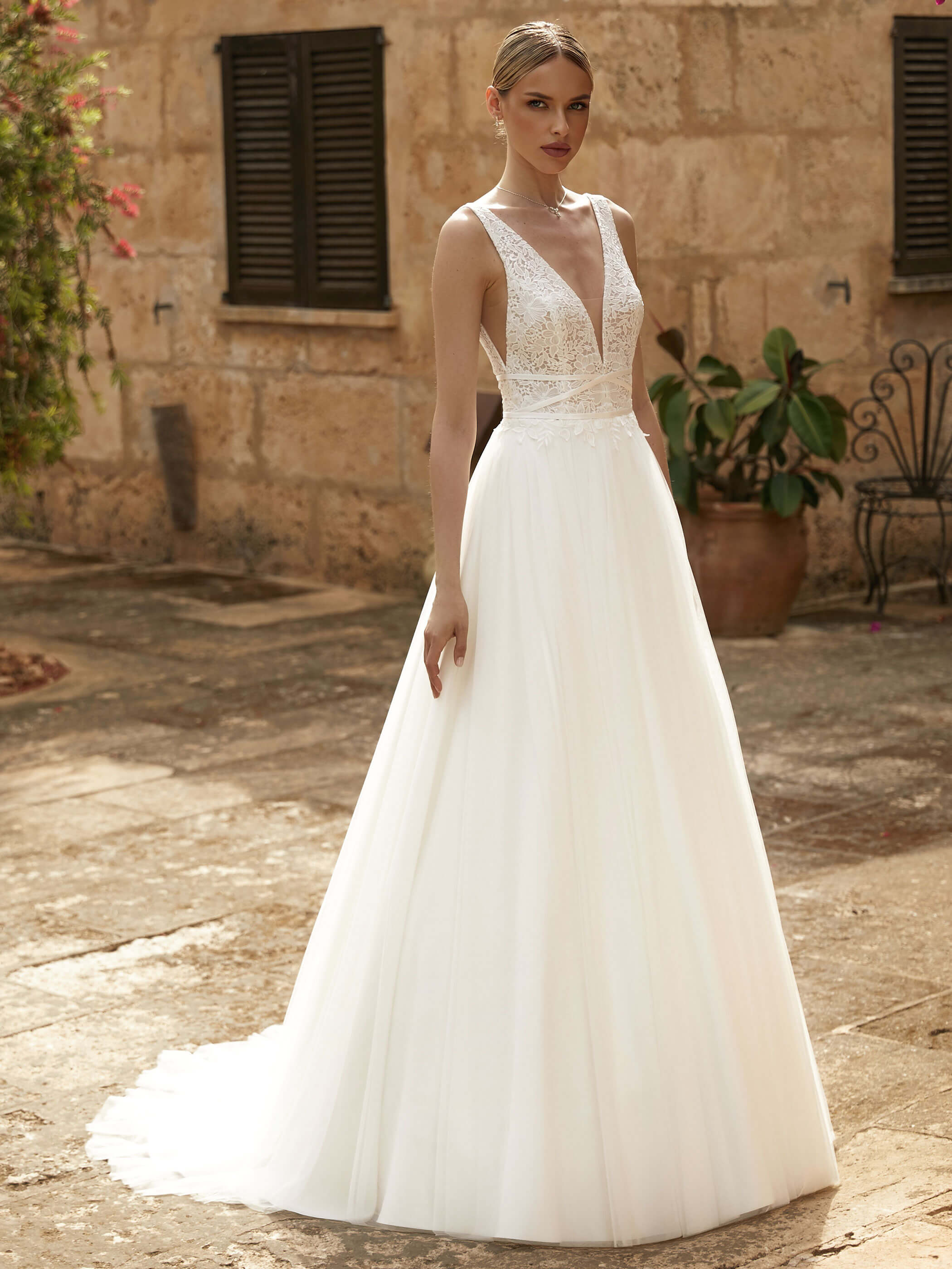 Abito sposa lungo scivolato realizzato con gonna tulle e corpetto in pizzo caratterizzato da profondi scolli a V.