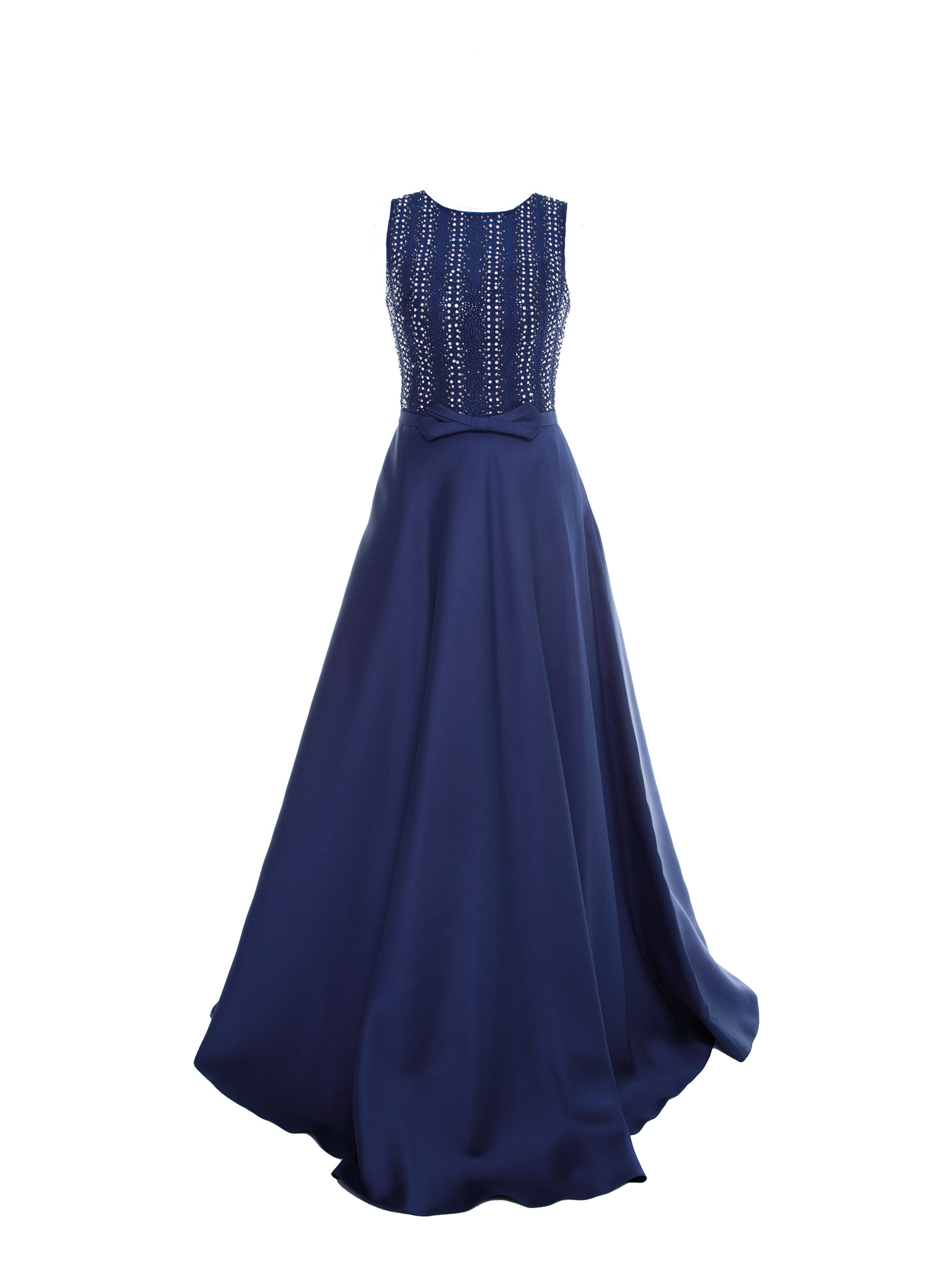 Abito cerimonia donna lungo realizzato con ampia gonna in tessuto di mikado e corpetto smanicato ricamato con scollo a barchetta.