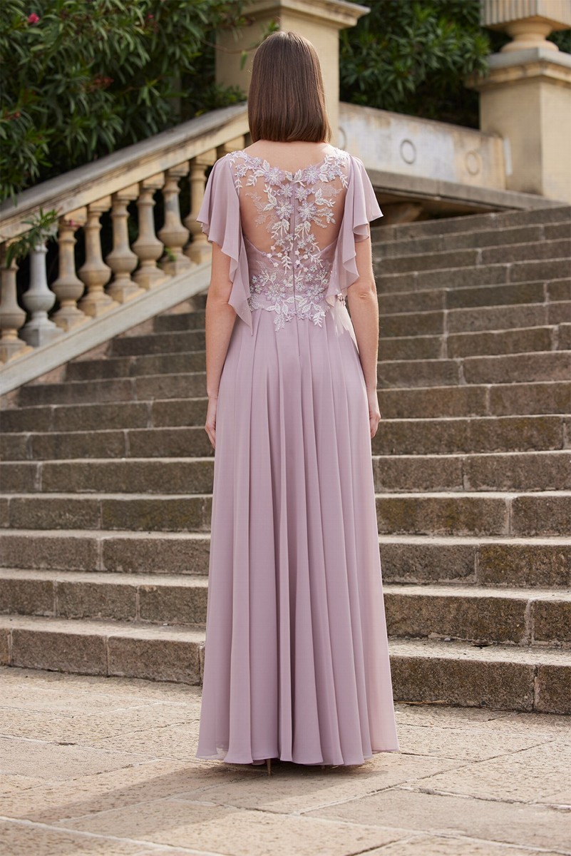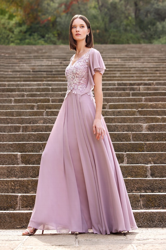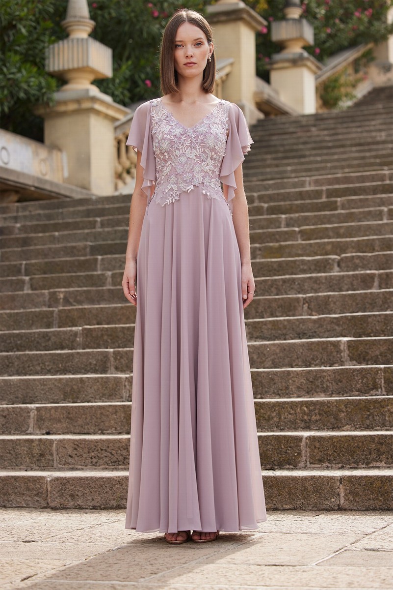 Abito cerimonia donna lungo realizzato in tessuto morbido di voile con corpetto di pizzo ricamato, manichette a sbuffo rosa cipria.