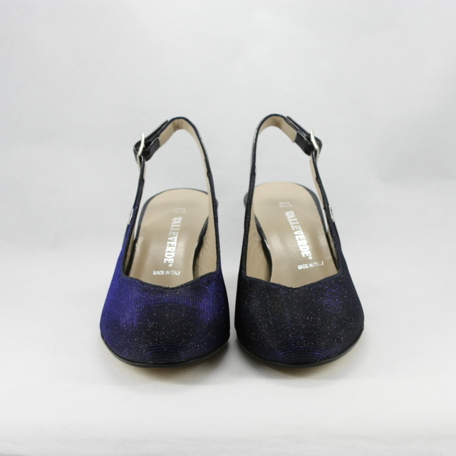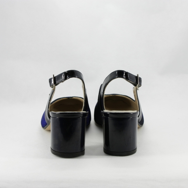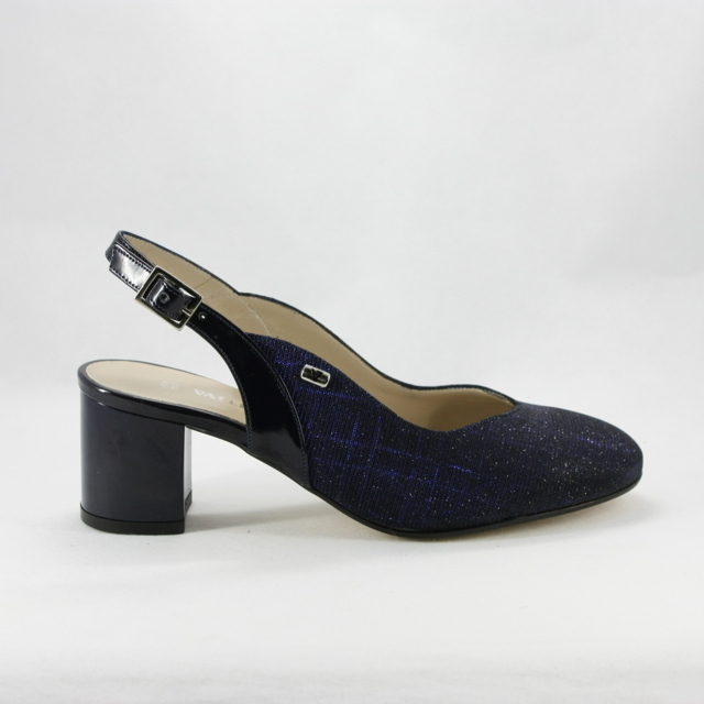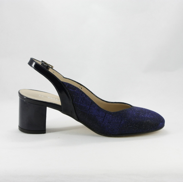 Scarpe cerimonia donna realizzate in raffinatissimo tessuto glitter color blu con tacco largo in vernice.
