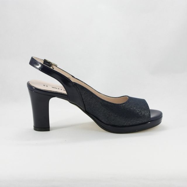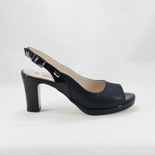 Confortevolissimo sandalo cerimonia donna realizzato in ecopella brillante con cinghietta regolabile alla caviglia e tacco largo.