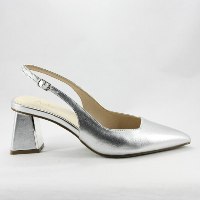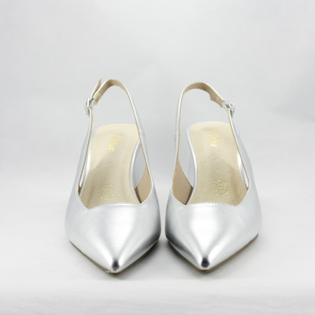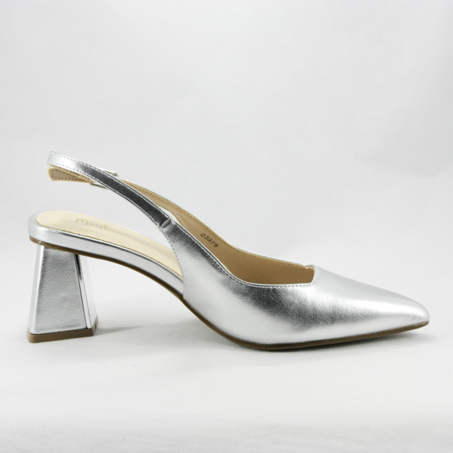 Scarpe cerimonia donna argento con punta sfilata e tacco largo con cinghietta regolabile alla caviglia.