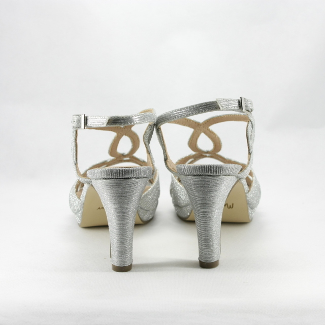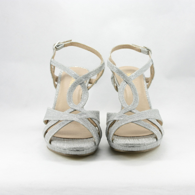 Sandalo cerimonia donna elegante comodo con tacco sfilato realizzato in tessuto glitter luminoso color argento.